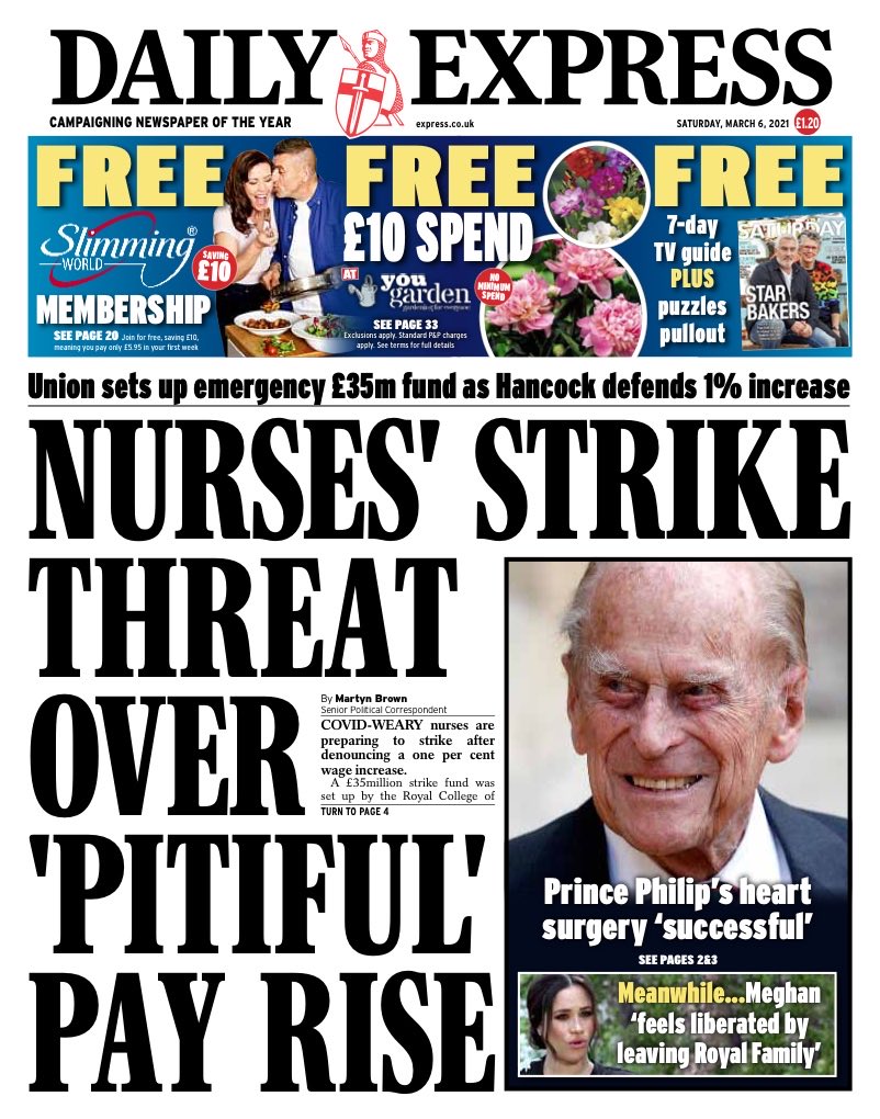 The Daily Express reports a £35m fund has been set up by the Royal College of Nursing as health workers prepare to strike over a proposed 1% pay rise.