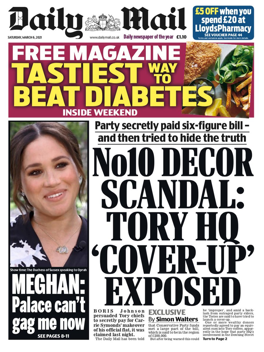 The Daily Mail says Boris Johnson used Conservative Party funds to pay most of the bill for a makeover of his Downing Street flat.