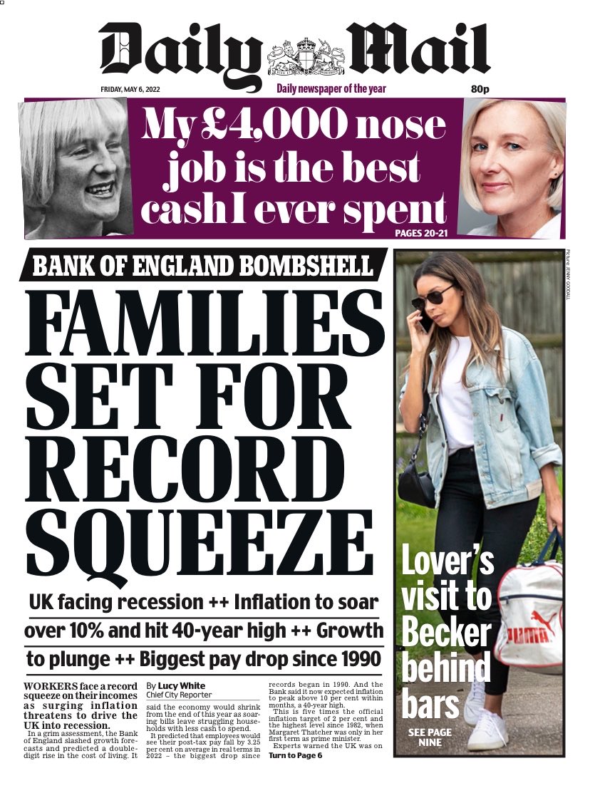Metro also reports that the Bank of England expects inflation to reach its highest level since 1982 later this year.