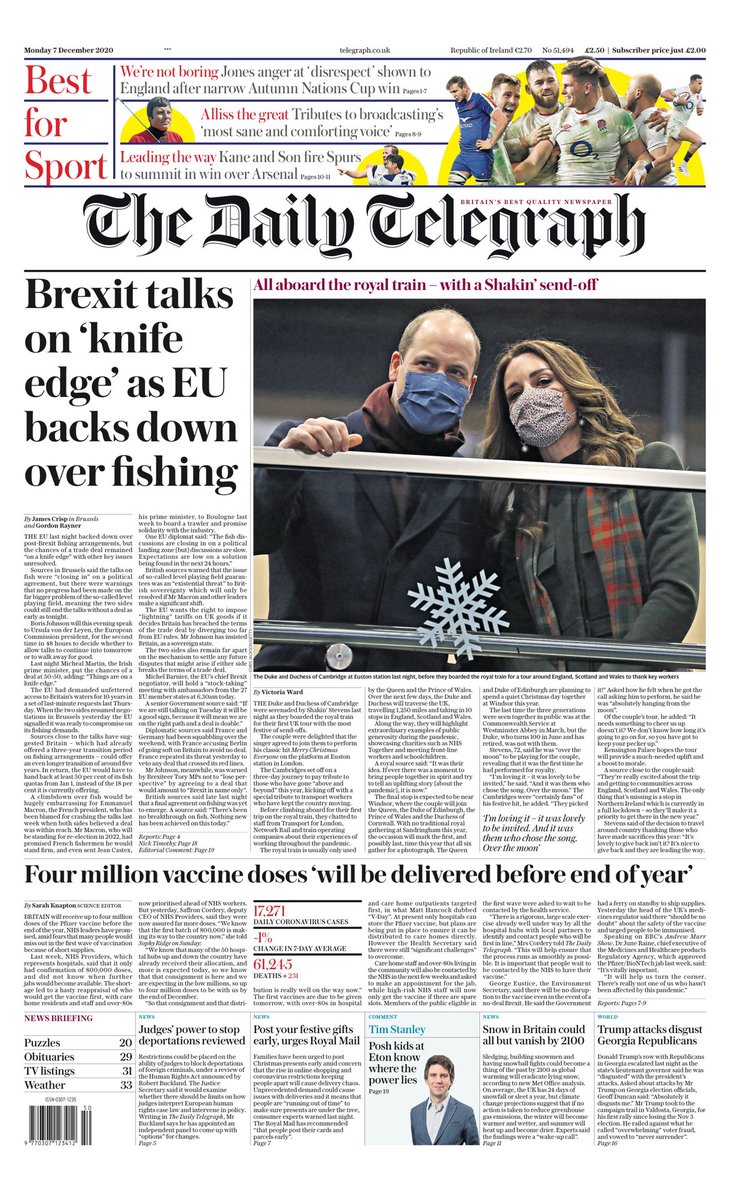 The EU has backed down over fishing arrangements but other key issues of post-Brexit trade talks remain unresolved, The Daily Telegraph says.