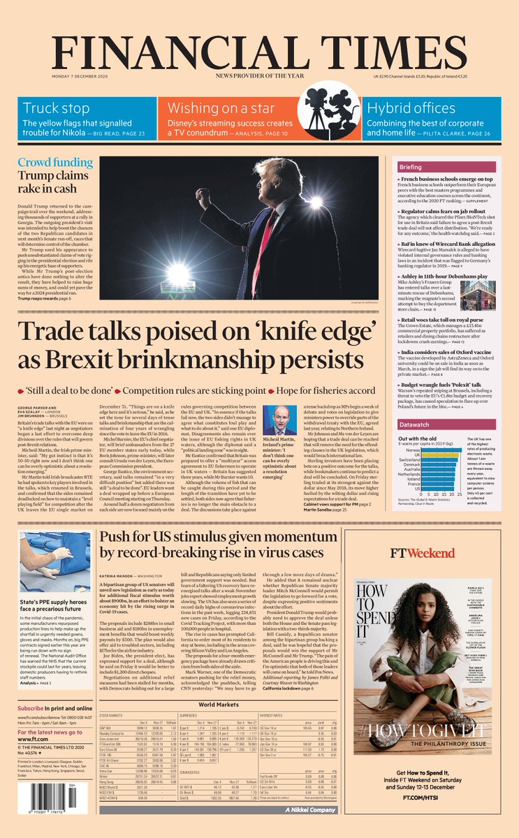 The Financial Times says Brexit trade talks are on a knife edge, with competition rules providing a major obstacle.