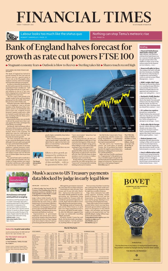 The Bank of England has halved its growth outlook, triggering a rate cut that boosts the FTSE 100 to record levels, while sterling slides and concerns of economic stagnation pose a setback for Reeves.