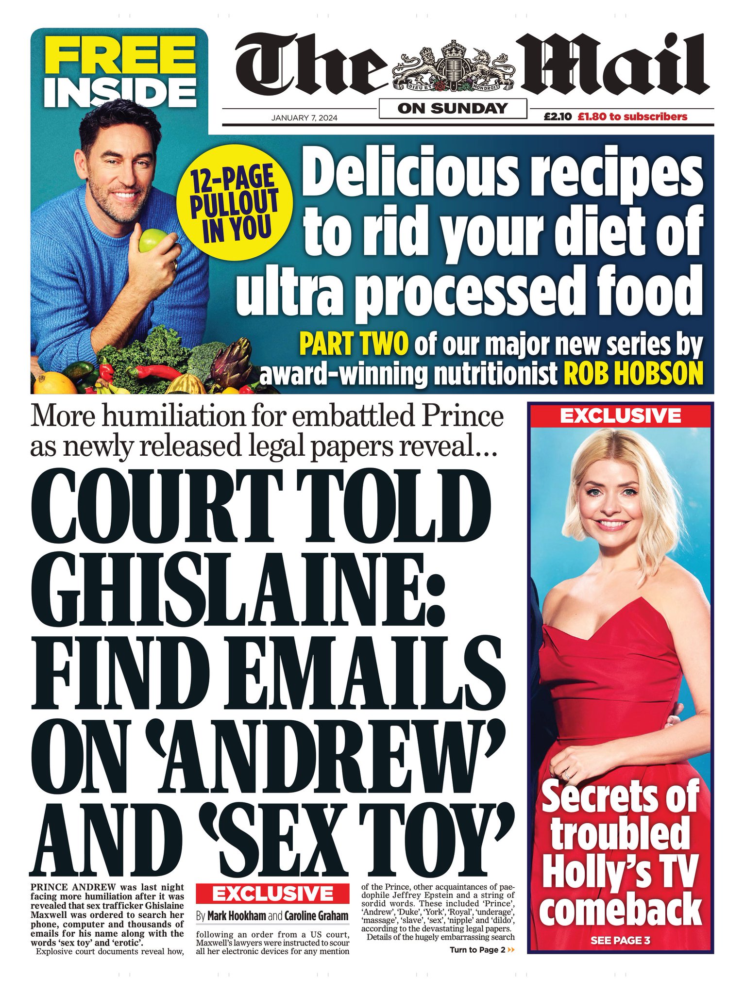 The Mail on Sunday leads with newly disclosed court documents containing allegations about Prince Andrew.