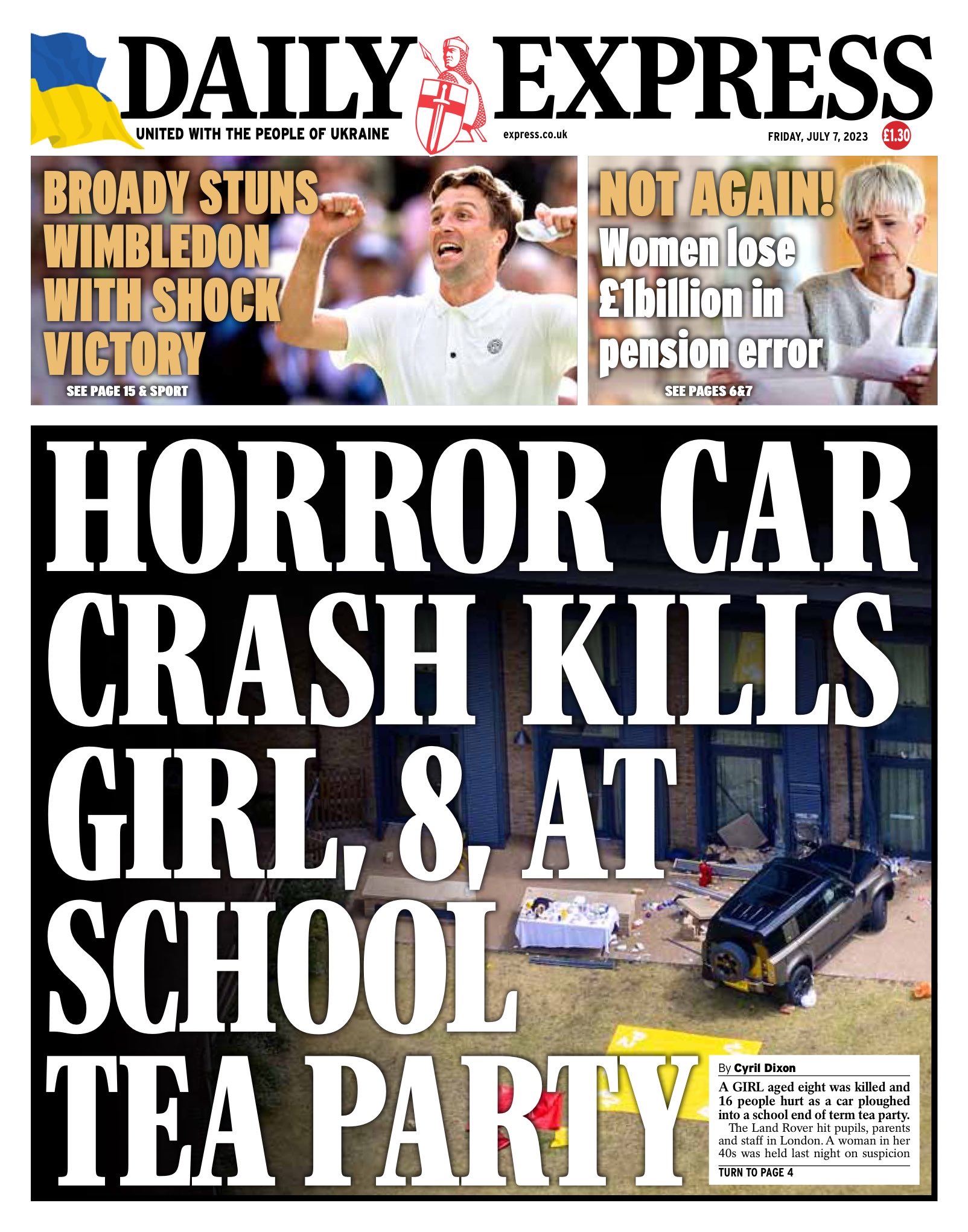 The Daily Express leads with the tragic incident of an eight-year-old girl losing her life when a car crashed into a school tea party in Wimbledon.
