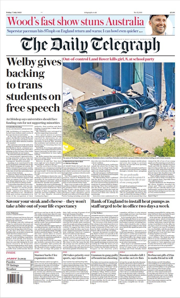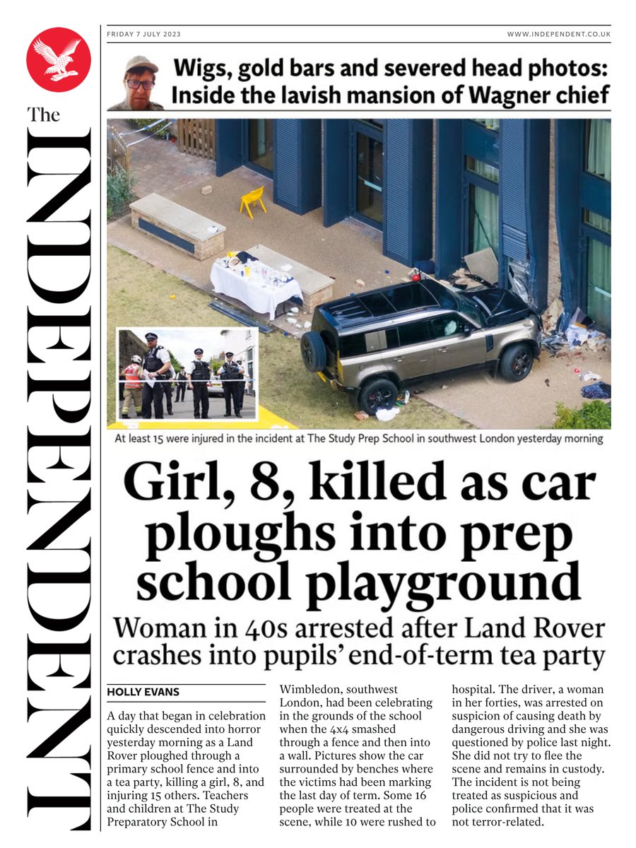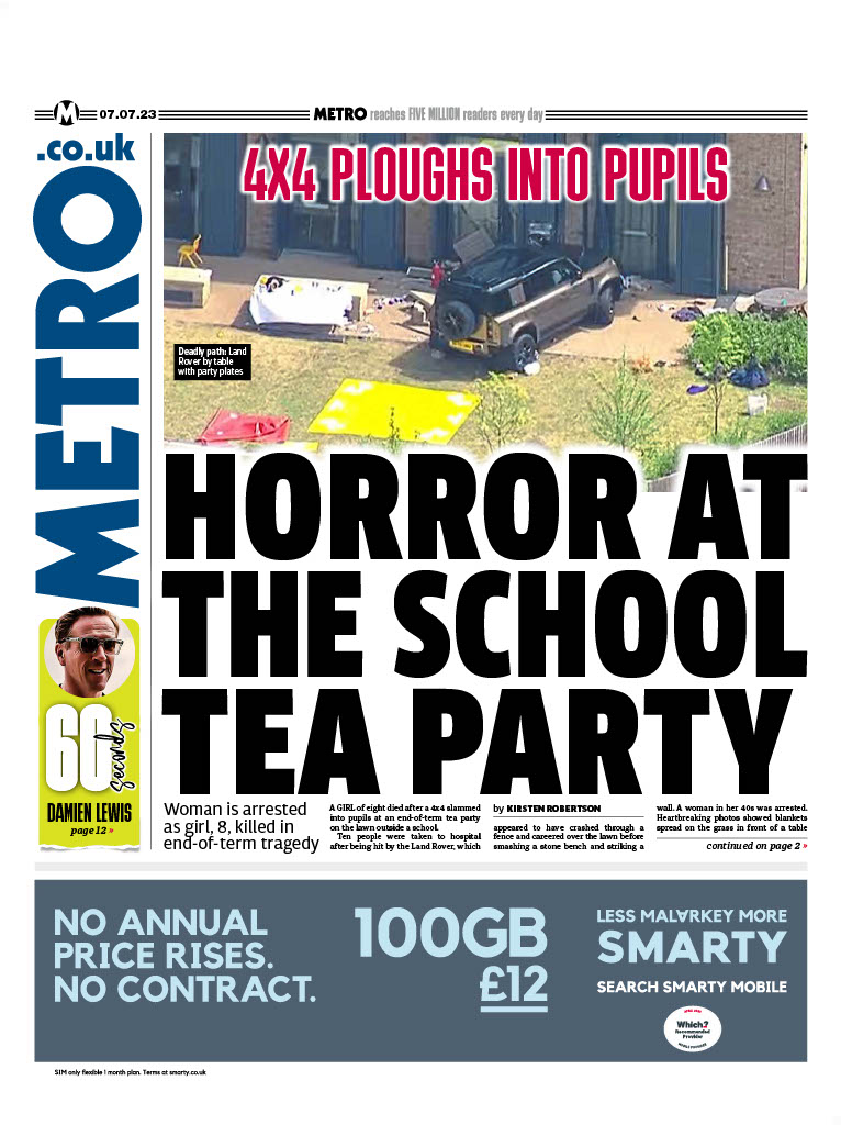 In Metro, the main story concerns a Land Rover crashing into students at a school party, causing the death of an eight-year-old girl, with the police ruling out terrorism as a motive.
