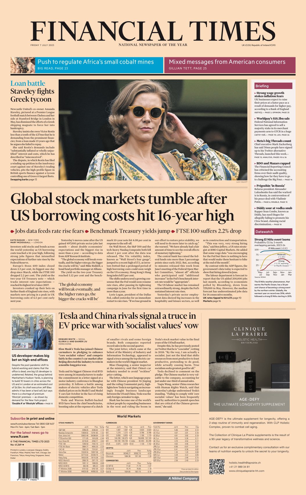 As per Financial Times, global stock markets faced a slump as US borrowing costs reached a peak unseen in 16 years.