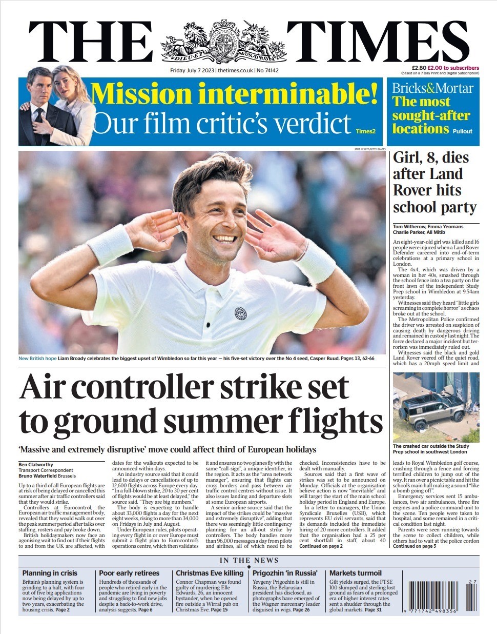 The Times discusses potential summer travel disruptions, predicting that strikes by air traffic controllers could delay or cancel up to a third of European flights.