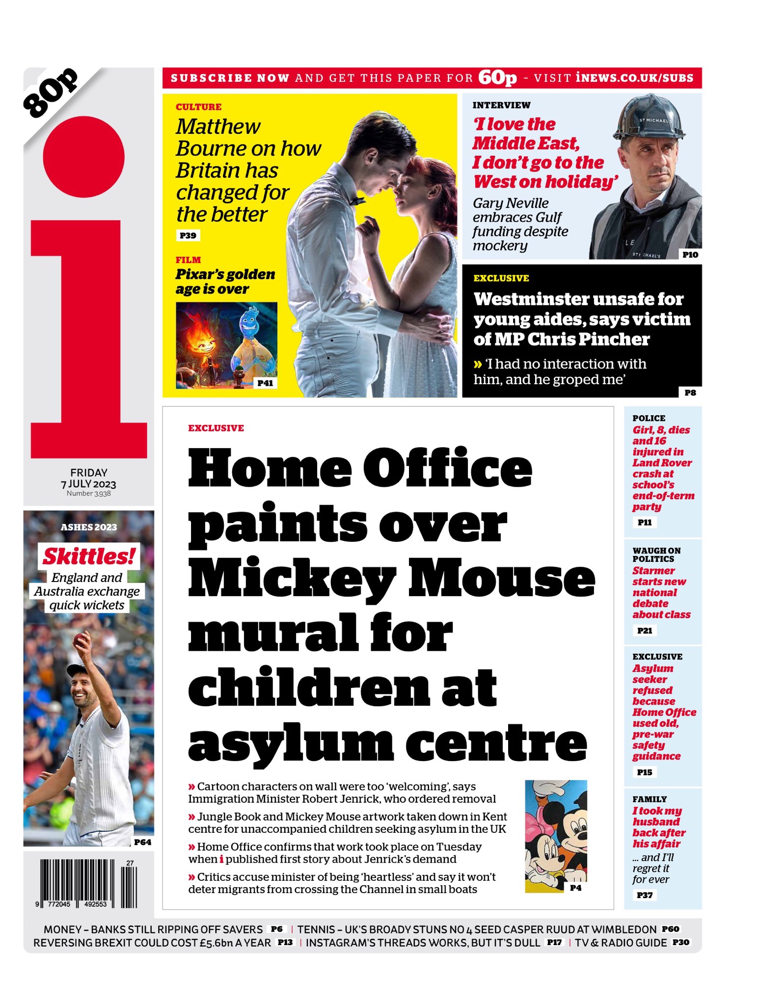 The i paper’s top story features Immigration Minister Robert Jenrick allegedly ordering the removal of a ‘too welcoming’ Mickey Mouse mural at an asylum centre.