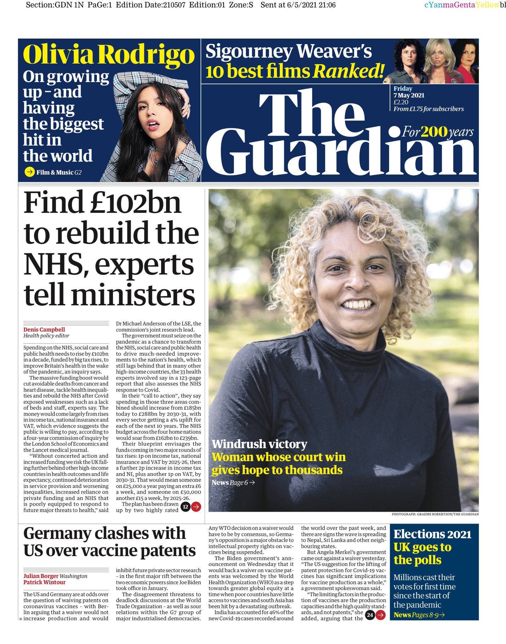 An inquiry says spending on the NHS, social care and public health needs to rise by £102bn in a decade, funded by big tax increases, to improve Britain’s health in the wake of the coronavirus pandemic, according to The Guardian.