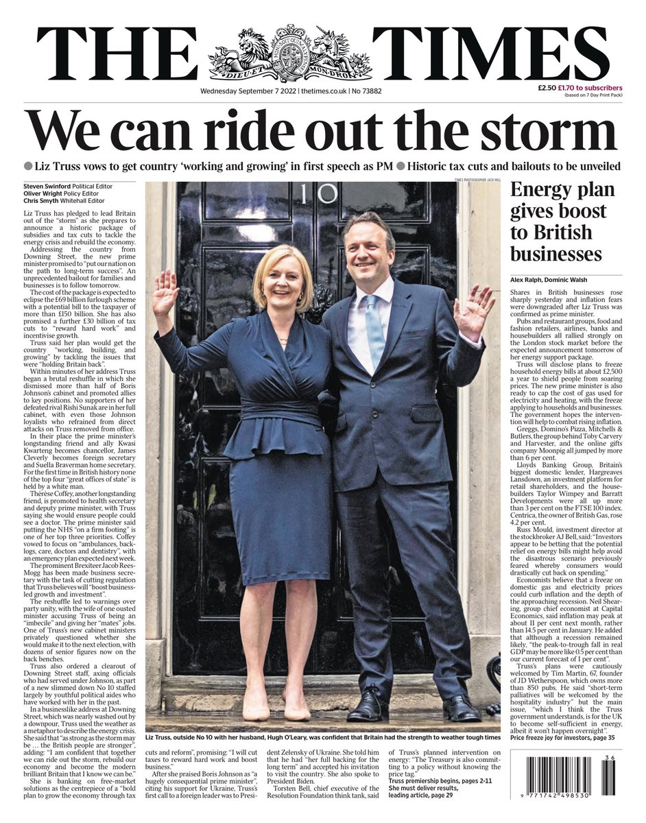 As Liz Truss began tackling an economic crisis with a massive energy bailout that could cost more than £150 billion, the new prime minister vowed Britain would “ride out the storm.”