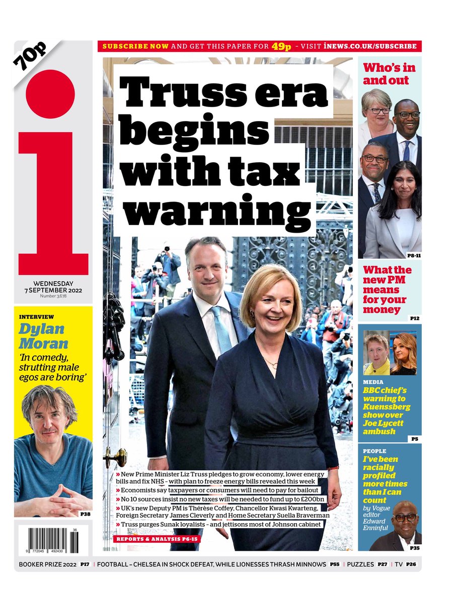I reports that Liz Truss’ era will begin with a tax warning as she vows to grow the economy, lower energy bills, and fix the NHS.
