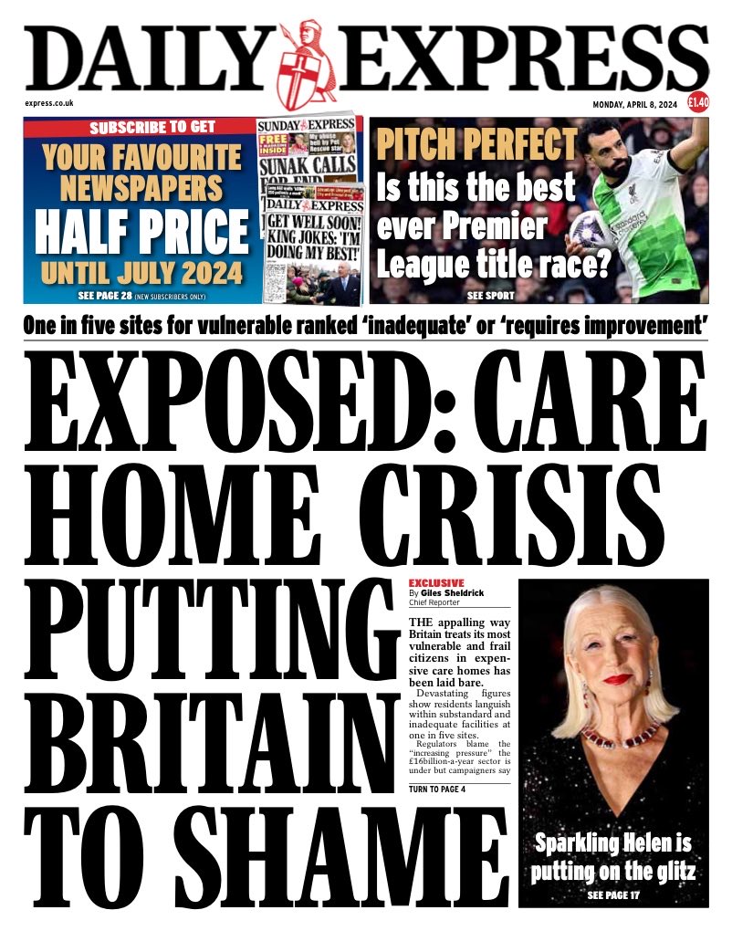 The Daily Express reports that a fifth of care homes are deemed substandard.