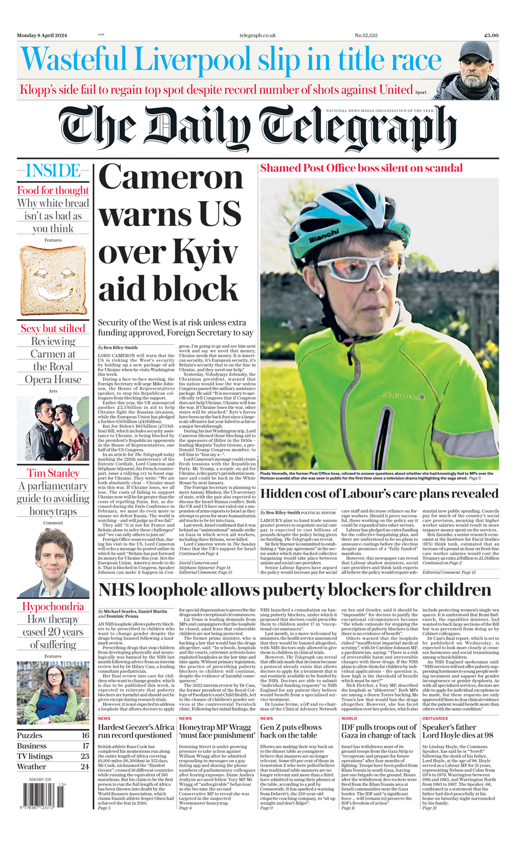 The Daily Telegraph reports on the foreign secretary’s warning to the US about jeopardising Western security by delaying Ukraine’s aid package.