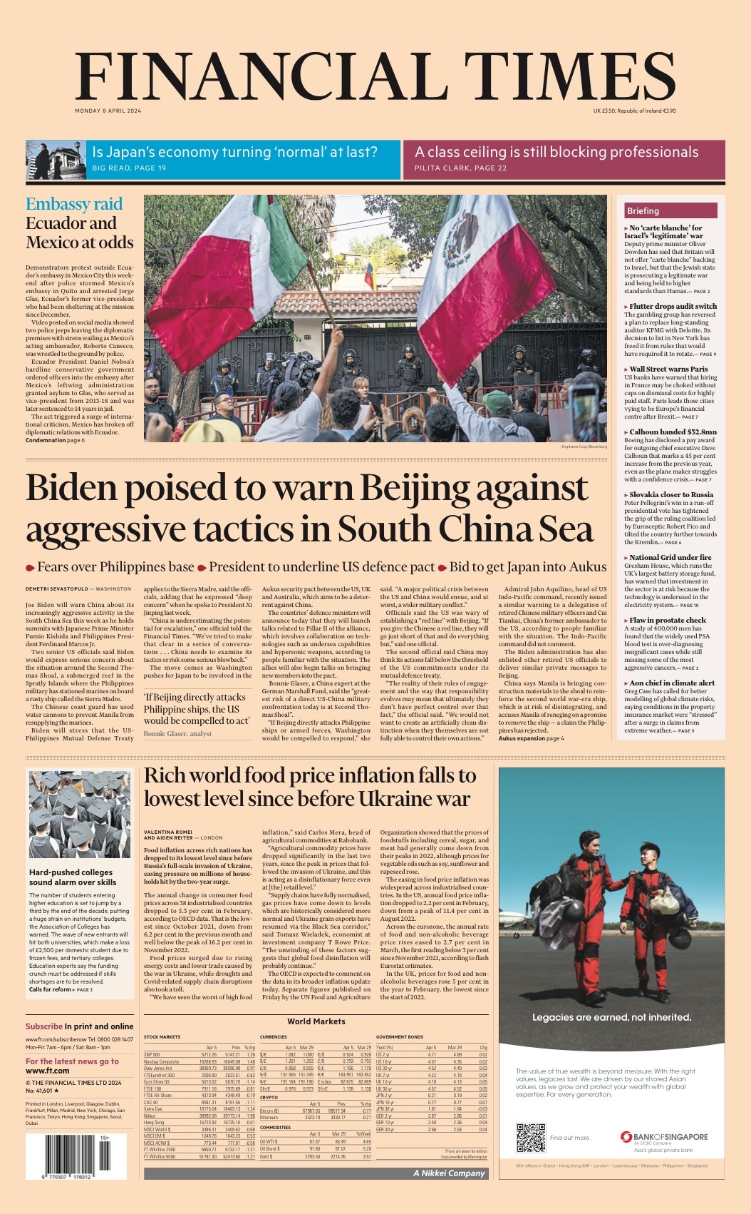 “Joe Biden to confront China over South China Sea aggression,” reports the Financial Times.