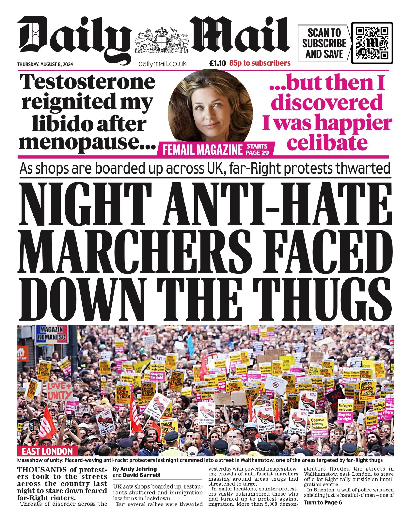 The Daily Mirror highlights the massive turnout of anti-racist demonstrators aiming to counter far-right extremists.