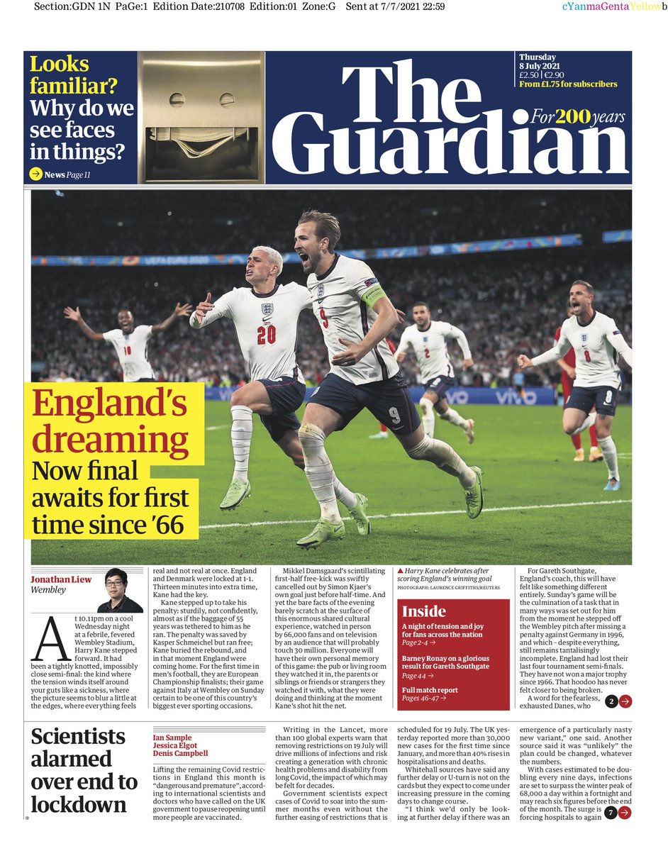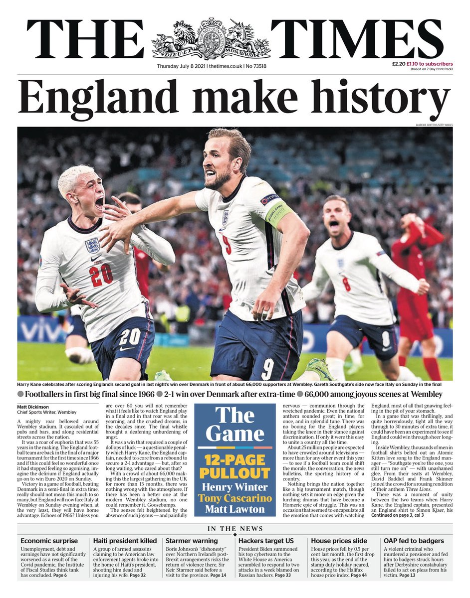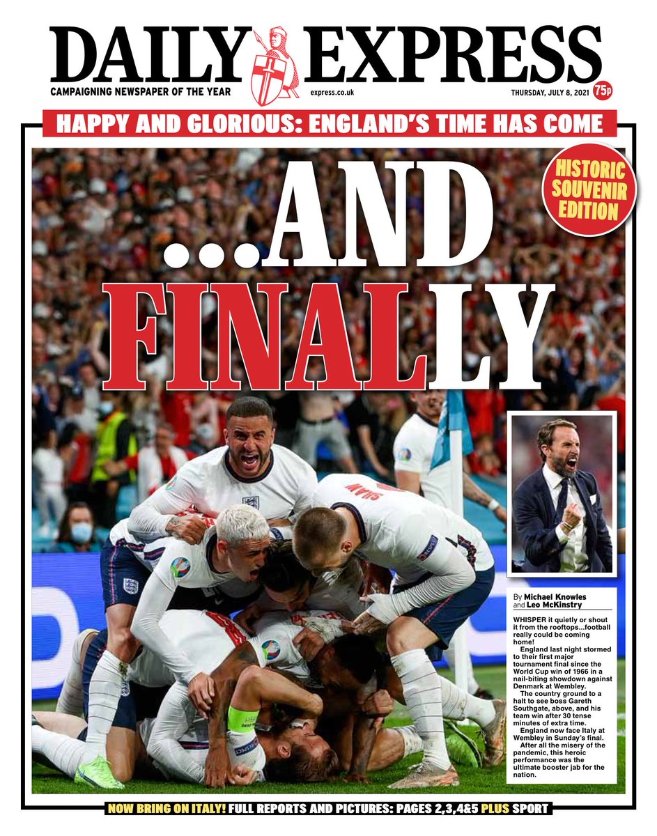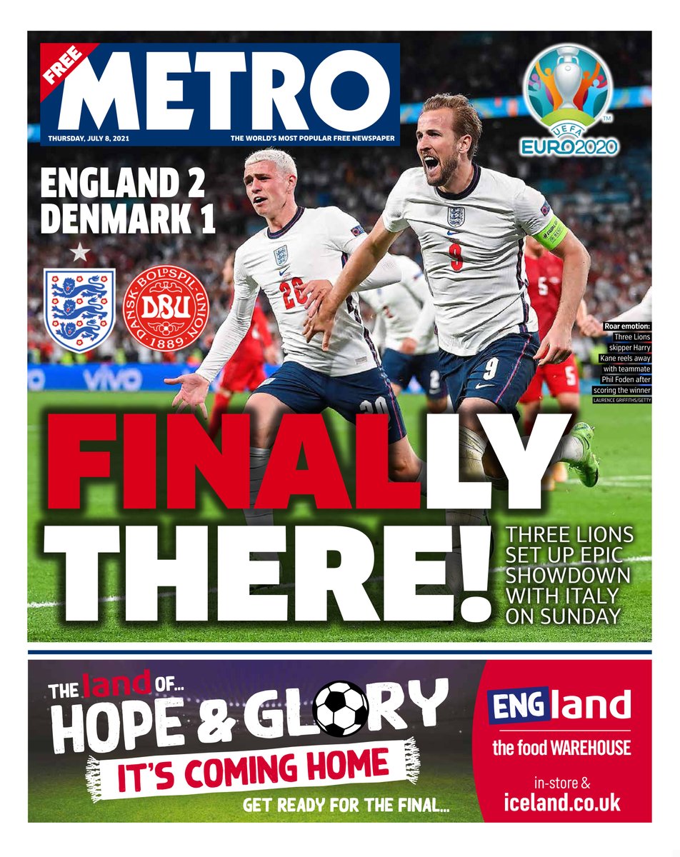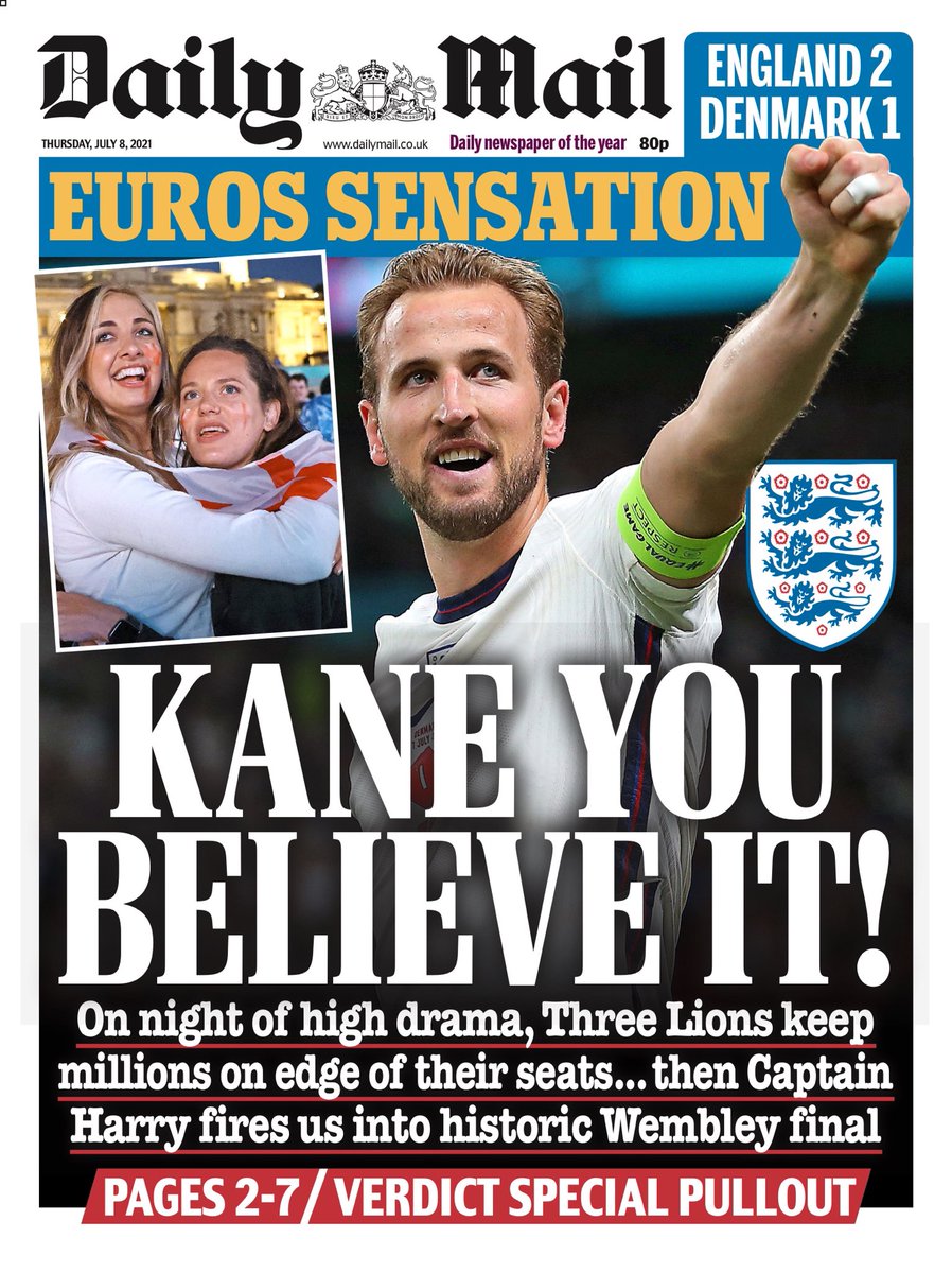 The Daily Mail writes that on a night of high drama, the Three Lions kept millions on the edge of their seats during the Euro semi-final game against Denmark, with Captain Harry Kane sending them to an historic Wembley final.