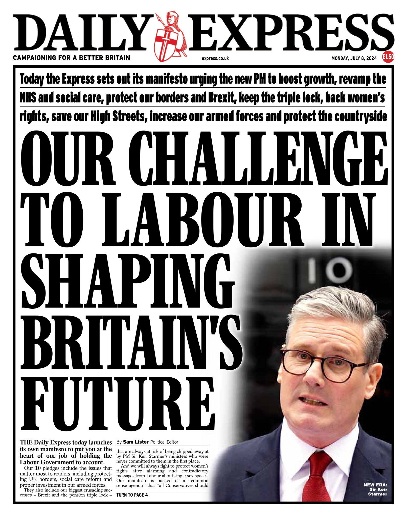 The Daily Express has launched its own manifesto to hold the Labour Government accountable, with key pledges including boosting growth, revamping the NHS, protecting borders and Brexit, maintaining the pension triple lock, backing women’s rights, saving High Streets, increasing the armed forces, and protecting the countryside.
