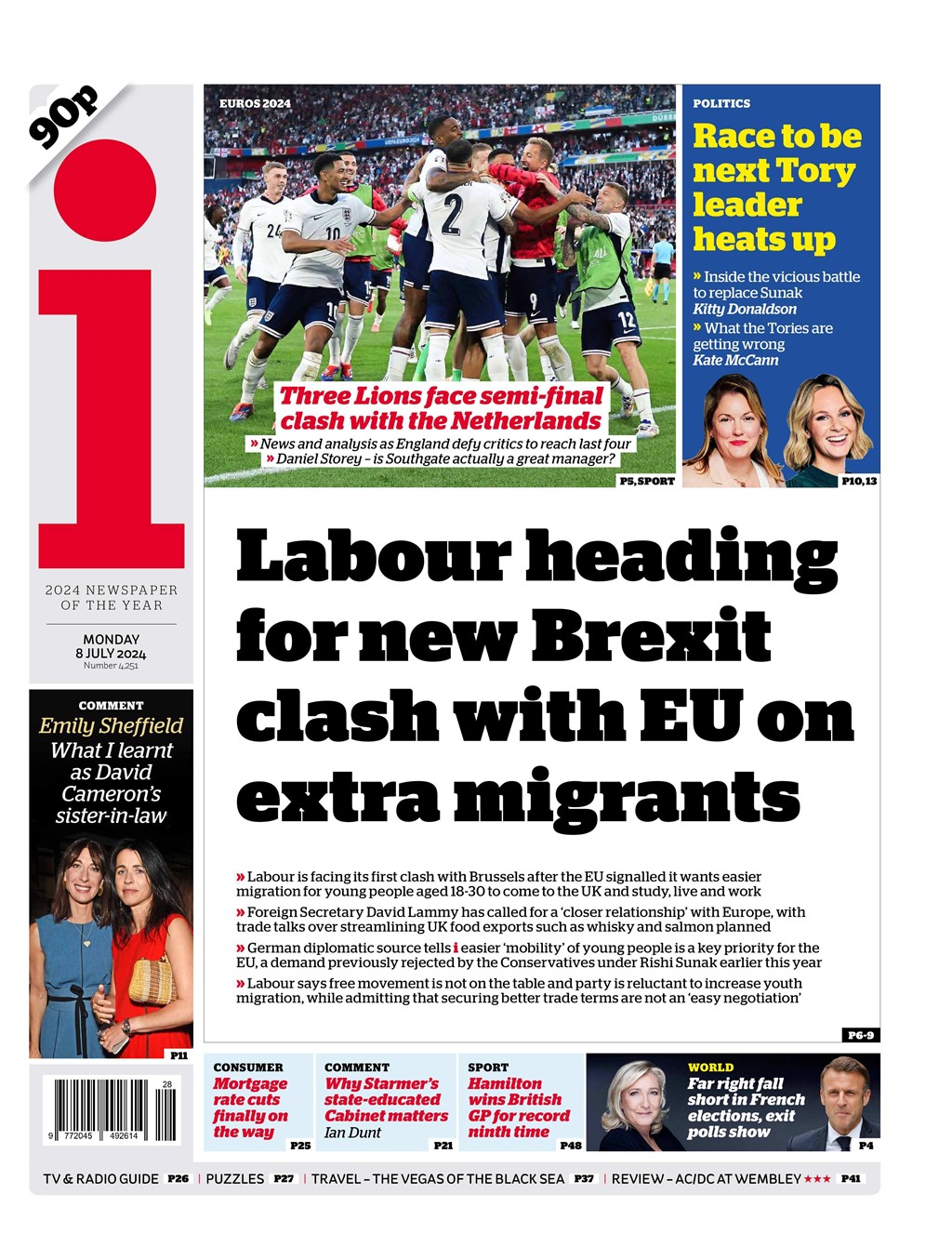 The i reports Labour’s first clash with Brussels as the EU aims to ease migration for young people aged 18-30 to the UK for studying, living, and working.