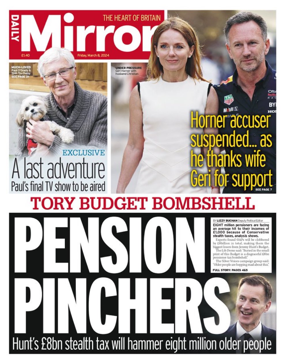 The Daily Mirror reports on the budget’s stealth taxes, which have left millions of pensioners out of pocket.
