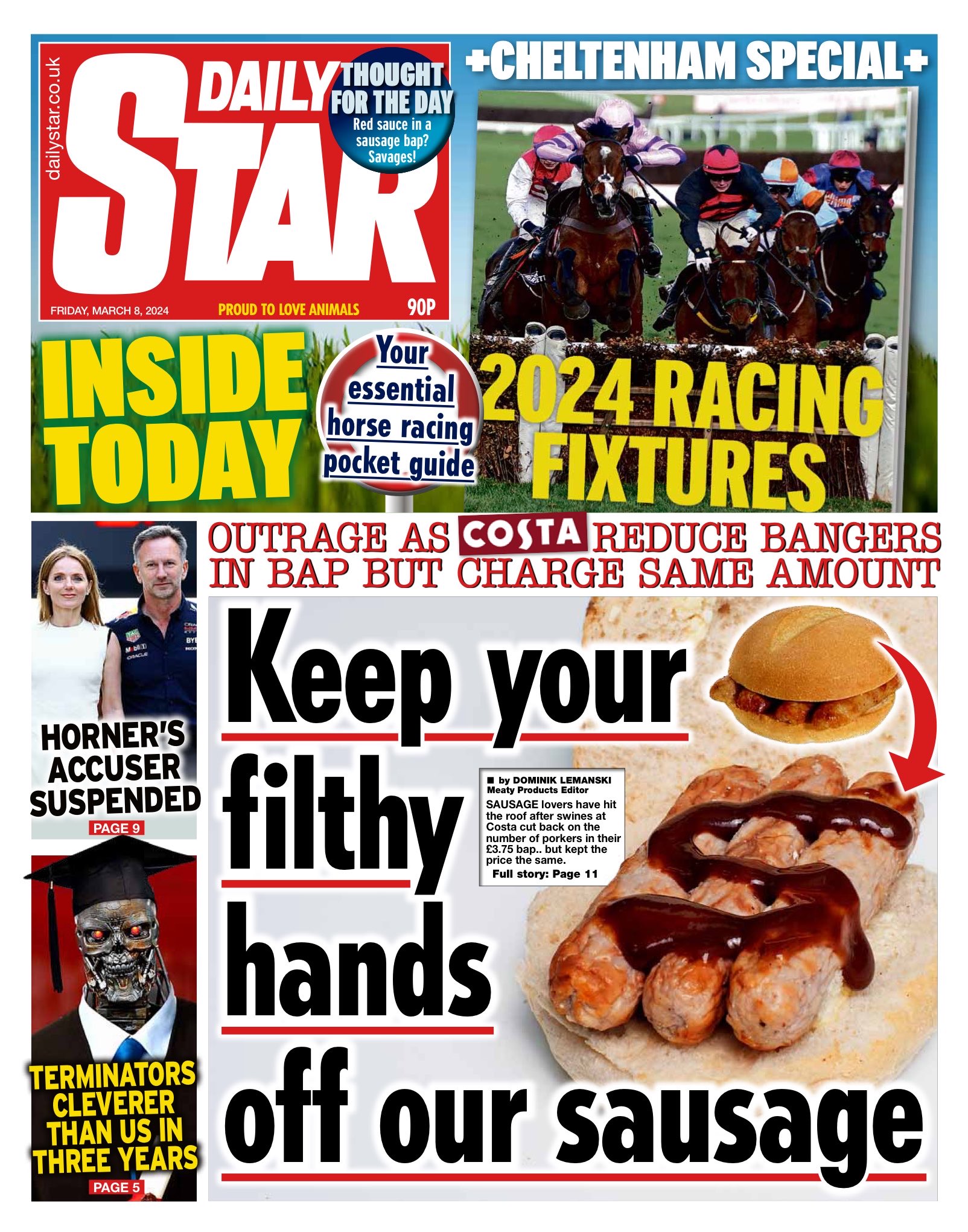 The Daily Star reports on Costa’s decision to reduce the sausage count in its baps, causing outrage among customers.