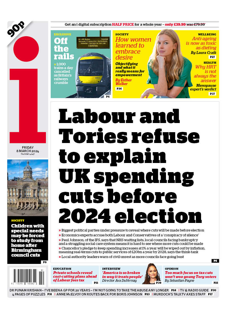 The i newspaper highlights claims of Labour and Conservatives’ silence on pre-election UK spending cuts.