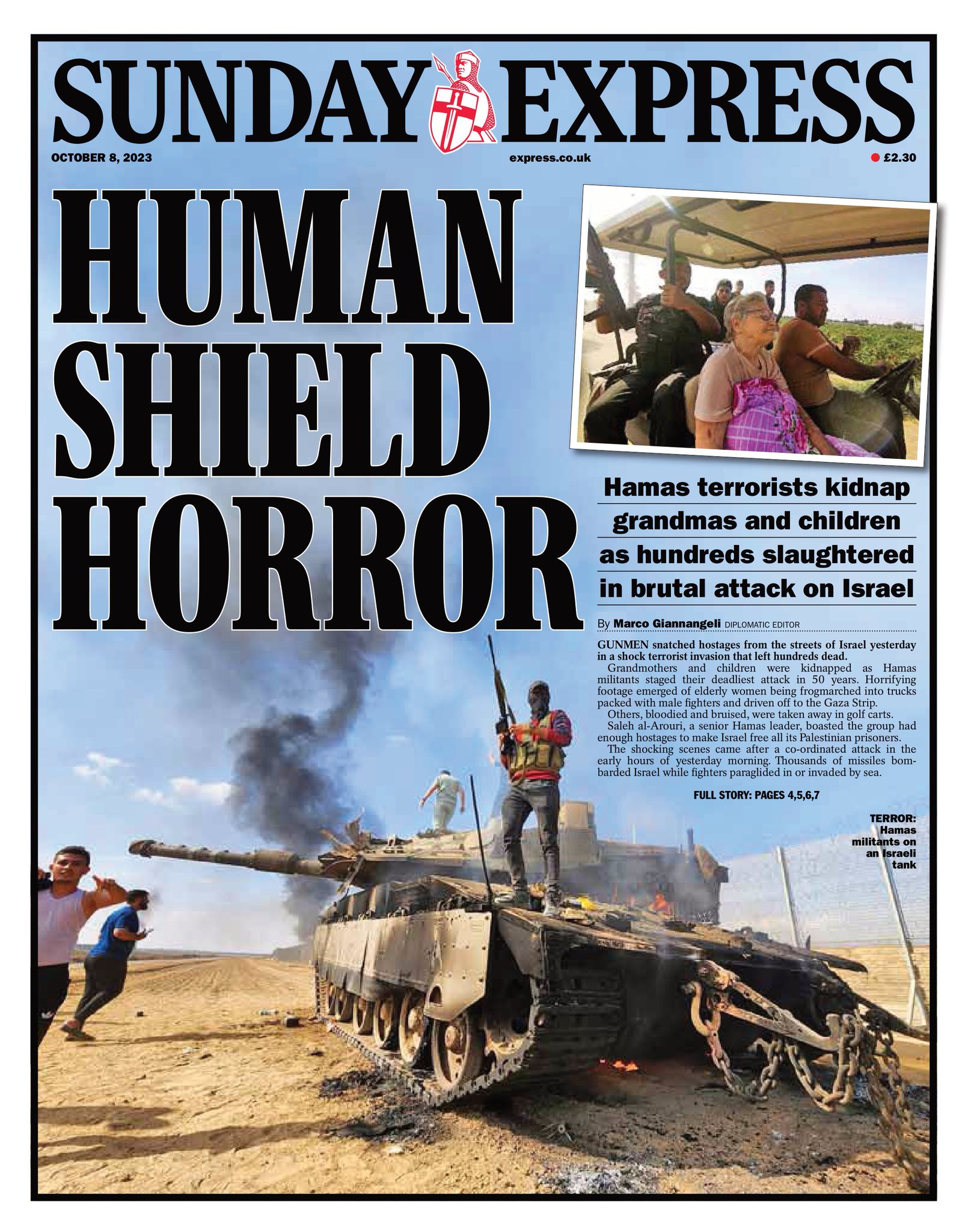 The Sunday Express reports on the horrifying use of human shields by Hamas militants following a surprise invasion.