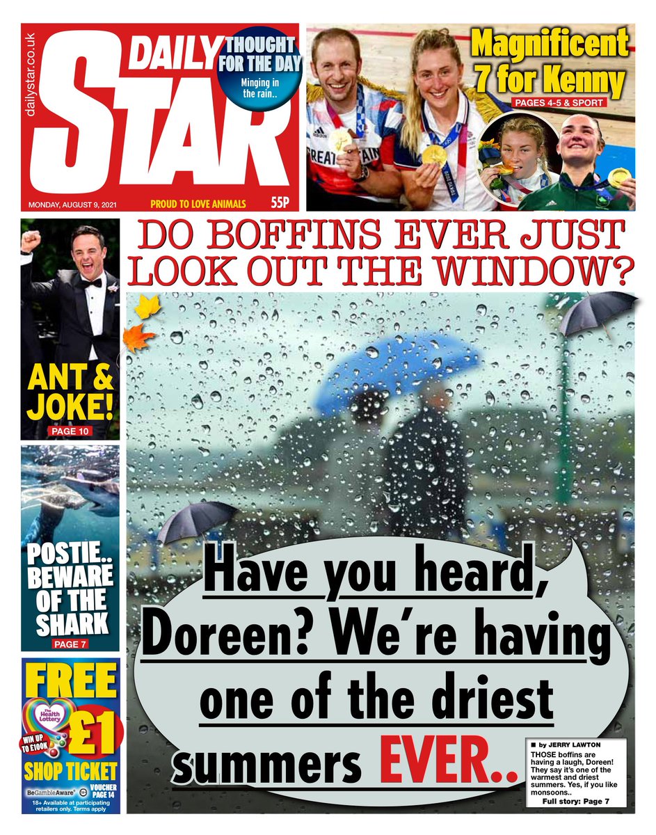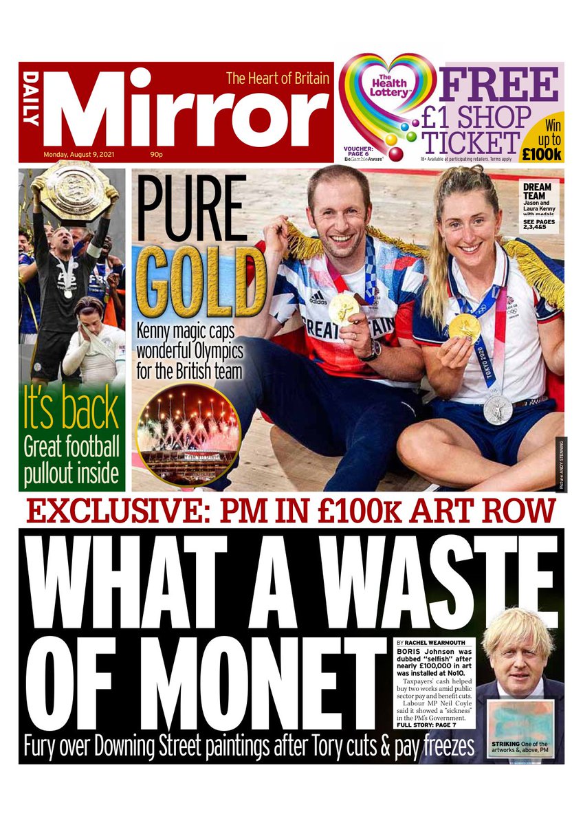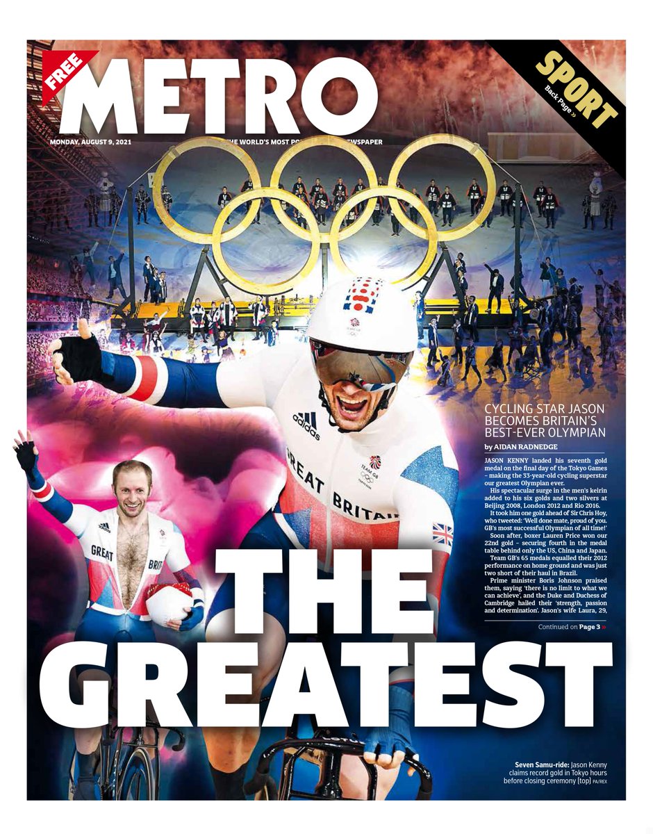 The Metro leads with the news that cycling star Jason Kenny is now Britain’s greatest Olympian ever after landing his seventh gold medal on the final day of the Games in Tokyo.