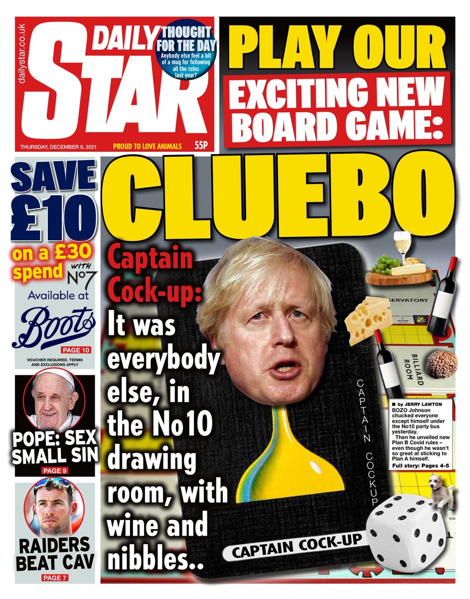 The Daily Star makes fun of the prime minister in a mock-up of the game Cluedo after he denied a party took place in Downing Street during last year’s lockdown.