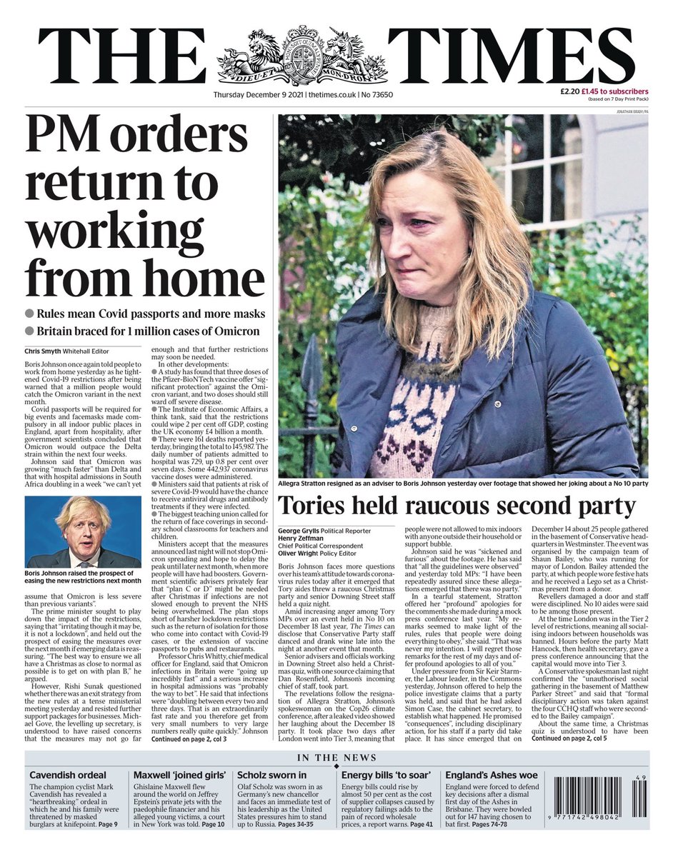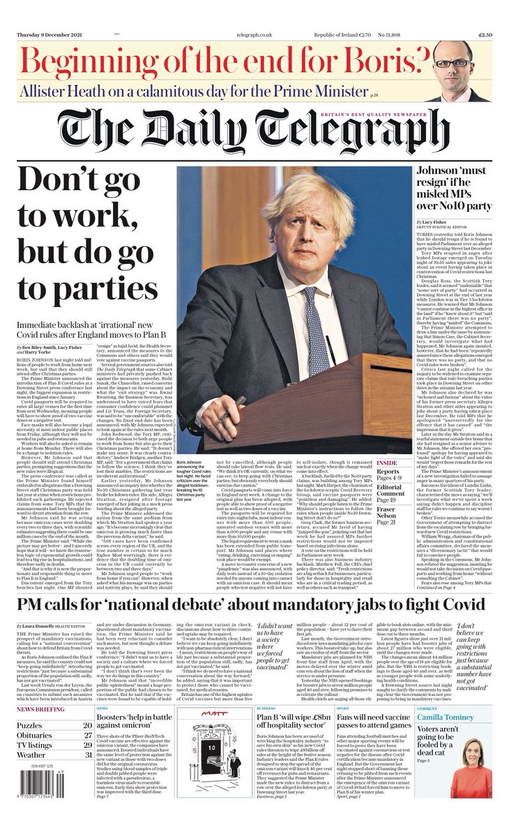 Boris Johnson has told millions of people to work from next week but said they should still attend Christmas parties, The Daily Telegraph reports.