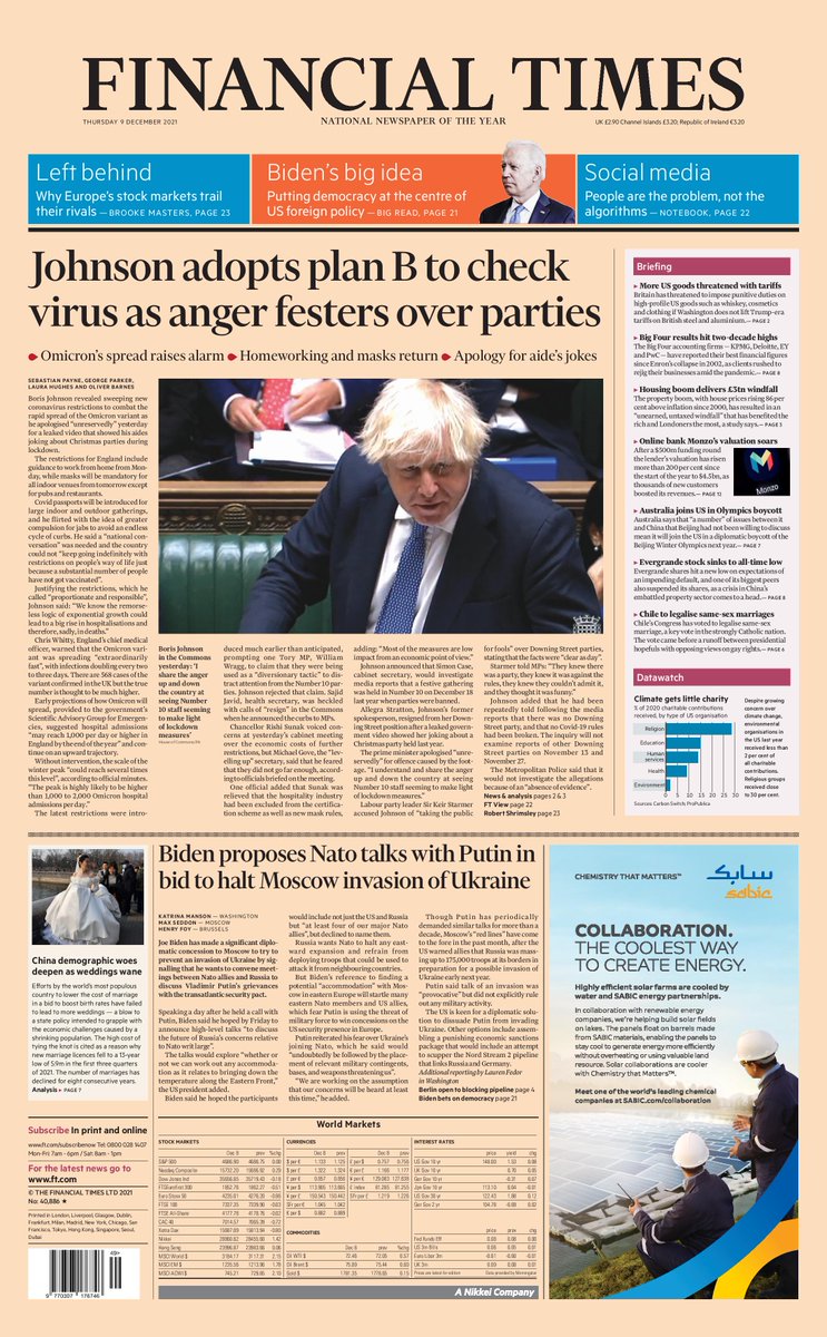 The prime minister has revealed “sweeping new coronavirus restrictions” to combat the spread of the Omicron variant after apologising for a video which showed Downing Street advisers joking about Christmas parties during lockdown, the Financial Times reports.