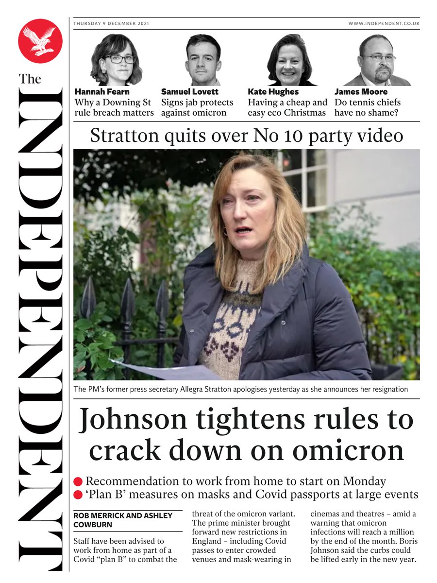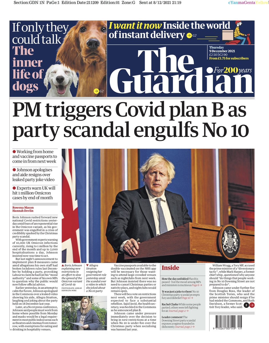 Boris Johnson has announced Plan B restrictions as his government is “engulfed in a crisis of credibility sparked by the Christmas party scandal”, The Guardian reports.