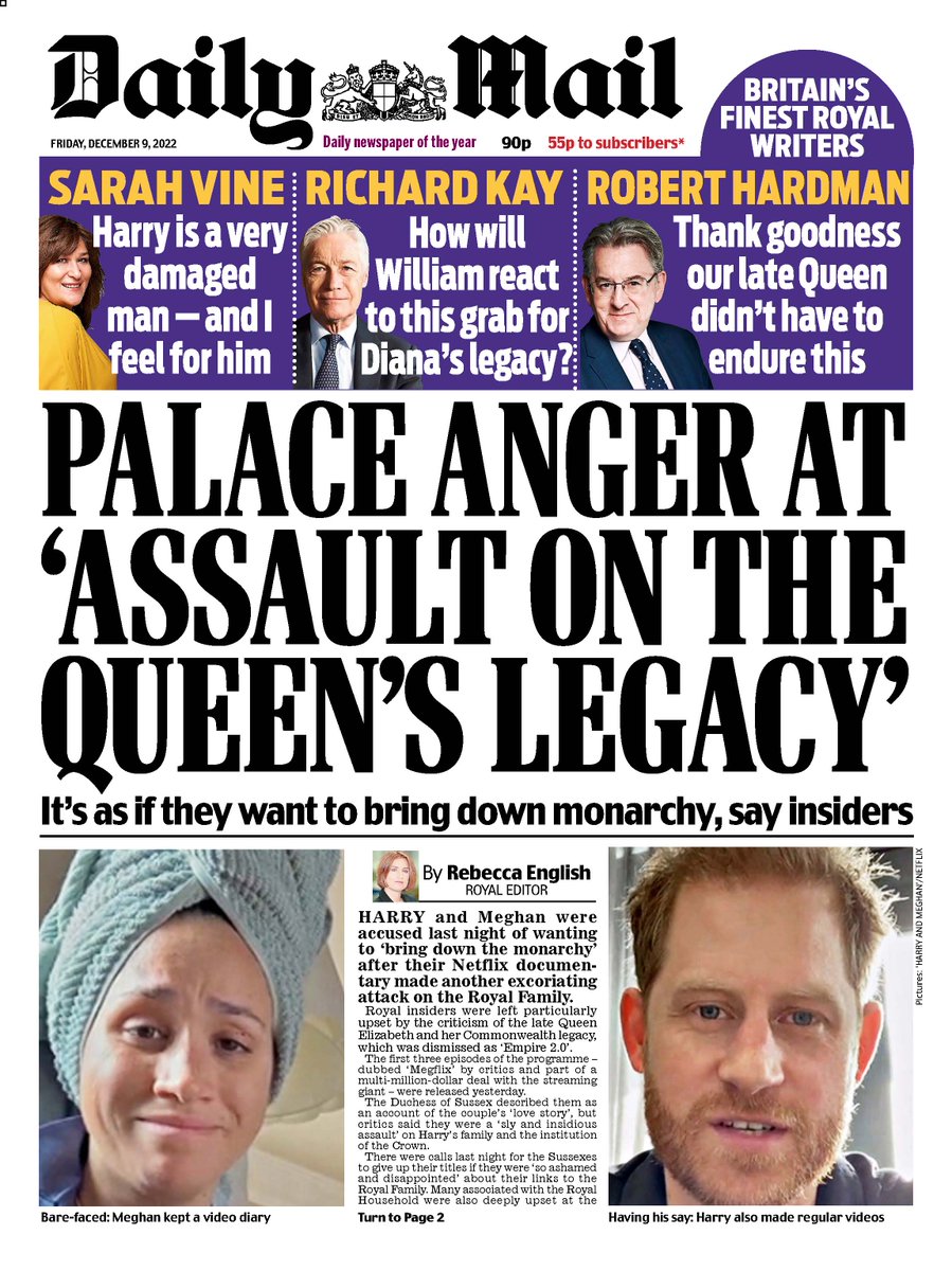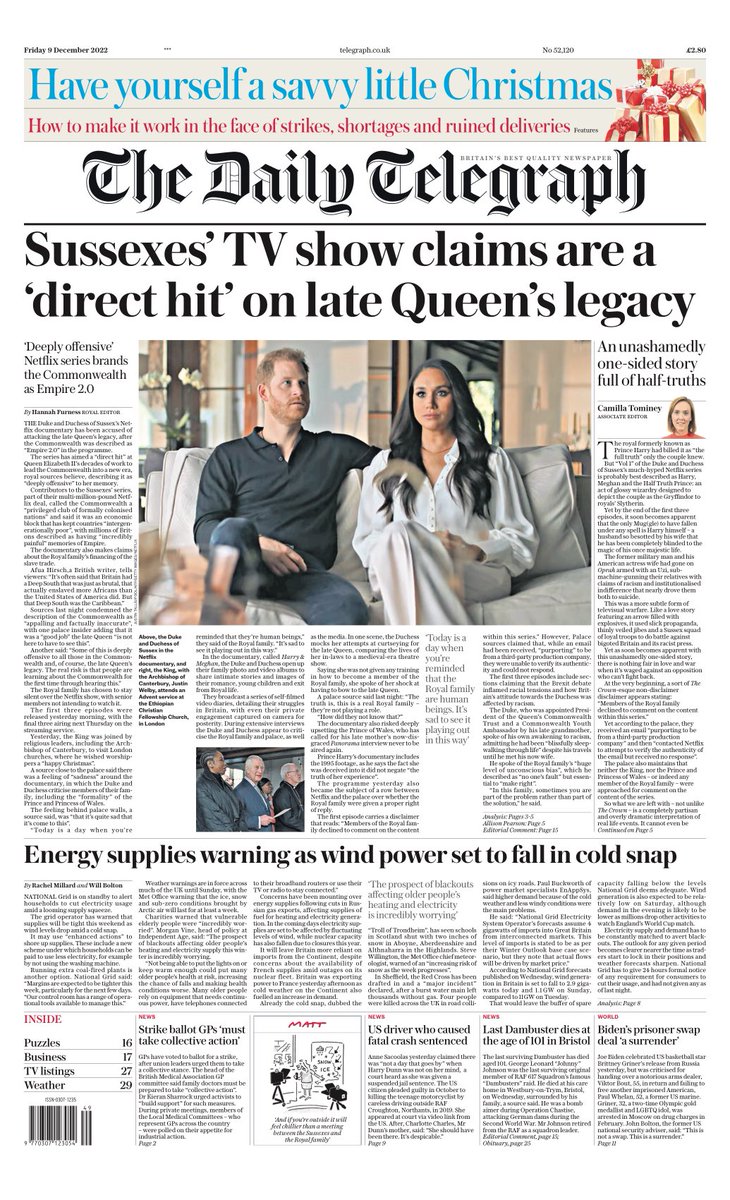 According to the Daily Telegraph, Harry and Meghan’s new documentary attacks the legacy of the Queen.