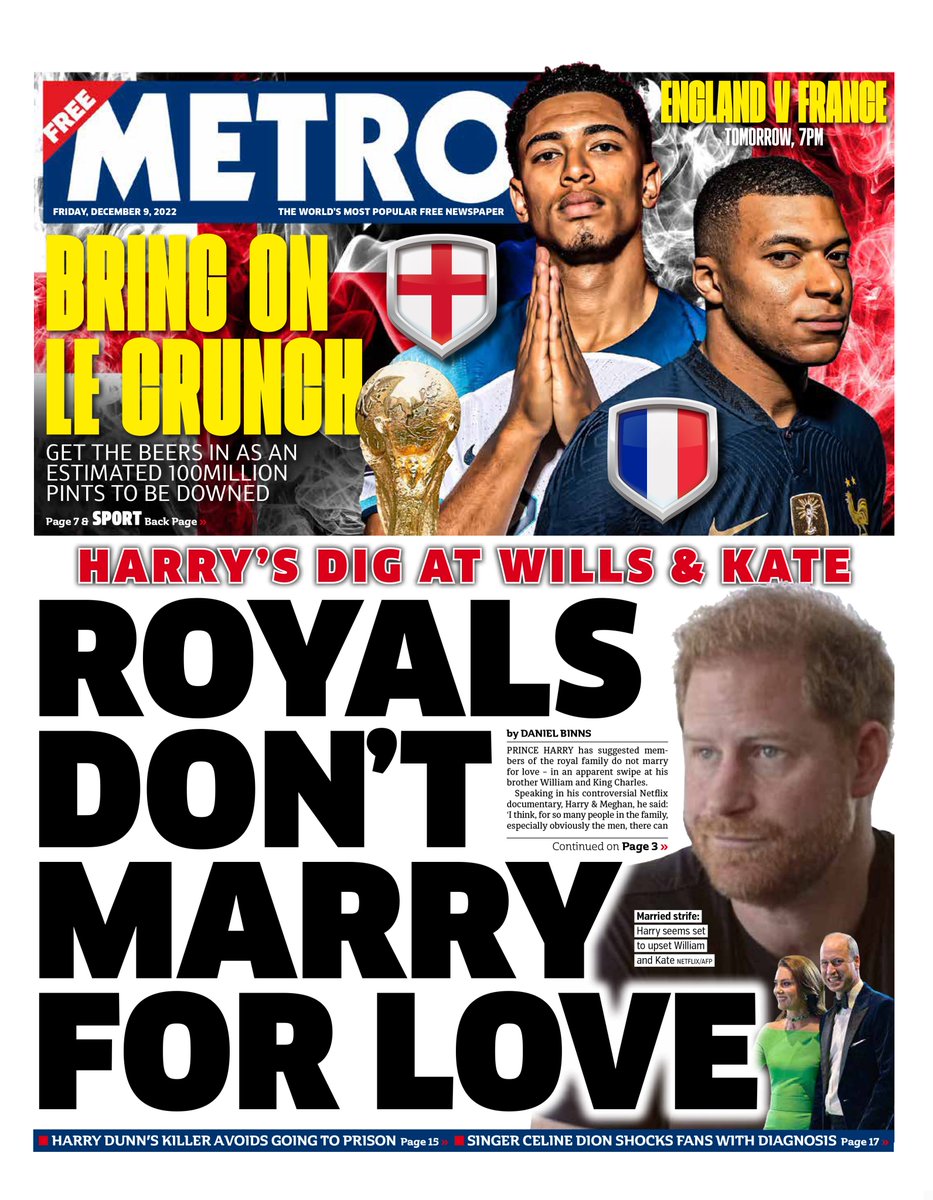 In a Netflix documentary that dominates the front page of Metro, Prince Harry claims that royals rarely marry out of love.
