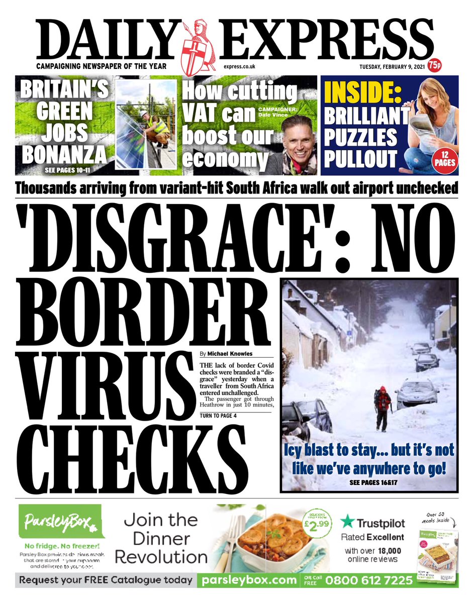 The Guardian says the new COVID variants are prompting calls for tougher border controls amid fears they may damage the UK’s vaccination programme.