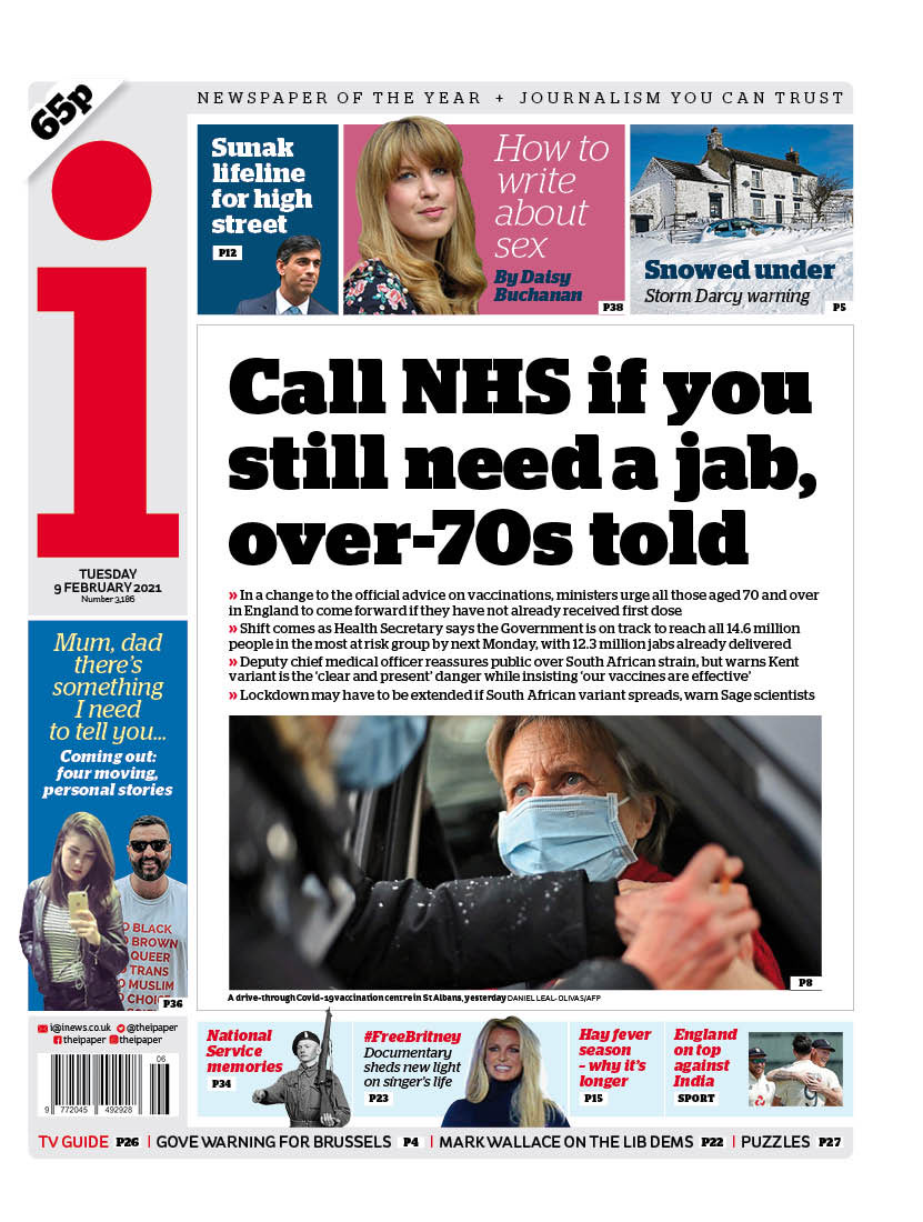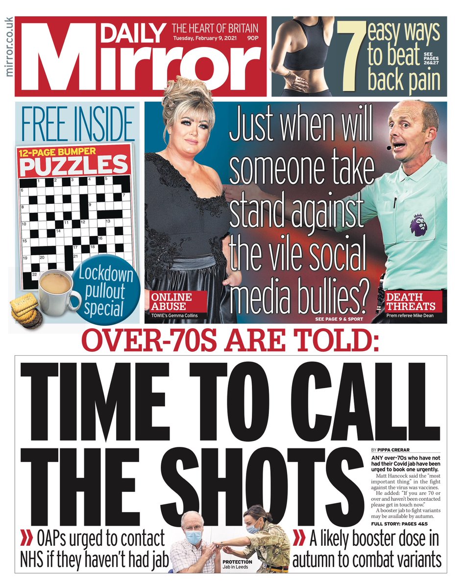 The Daily Mirror reports on people aged over 70 who have not had a COVID jab now being told to call the NHS, instead of waiting to be contacted for a vaccine appointment.