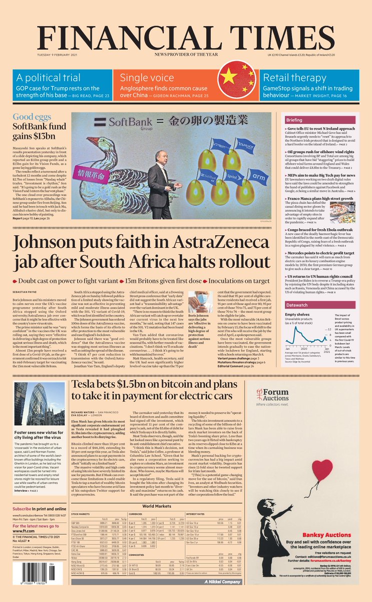 The Financial Times leads on Boris Johnson’s confidence in the Oxford/Astra Zeneca COVID vaccine despite concerns elsewhere over its efficacy against new variants.