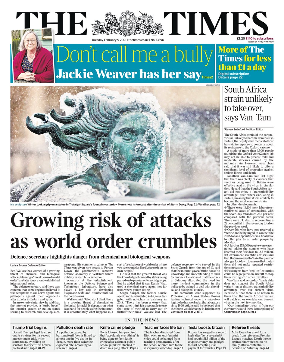 The Daily Telegraph leads on the South African variant of COVID, saying health chiefs are not concerned about it becoming the dominant strain of the virus in the UK.
