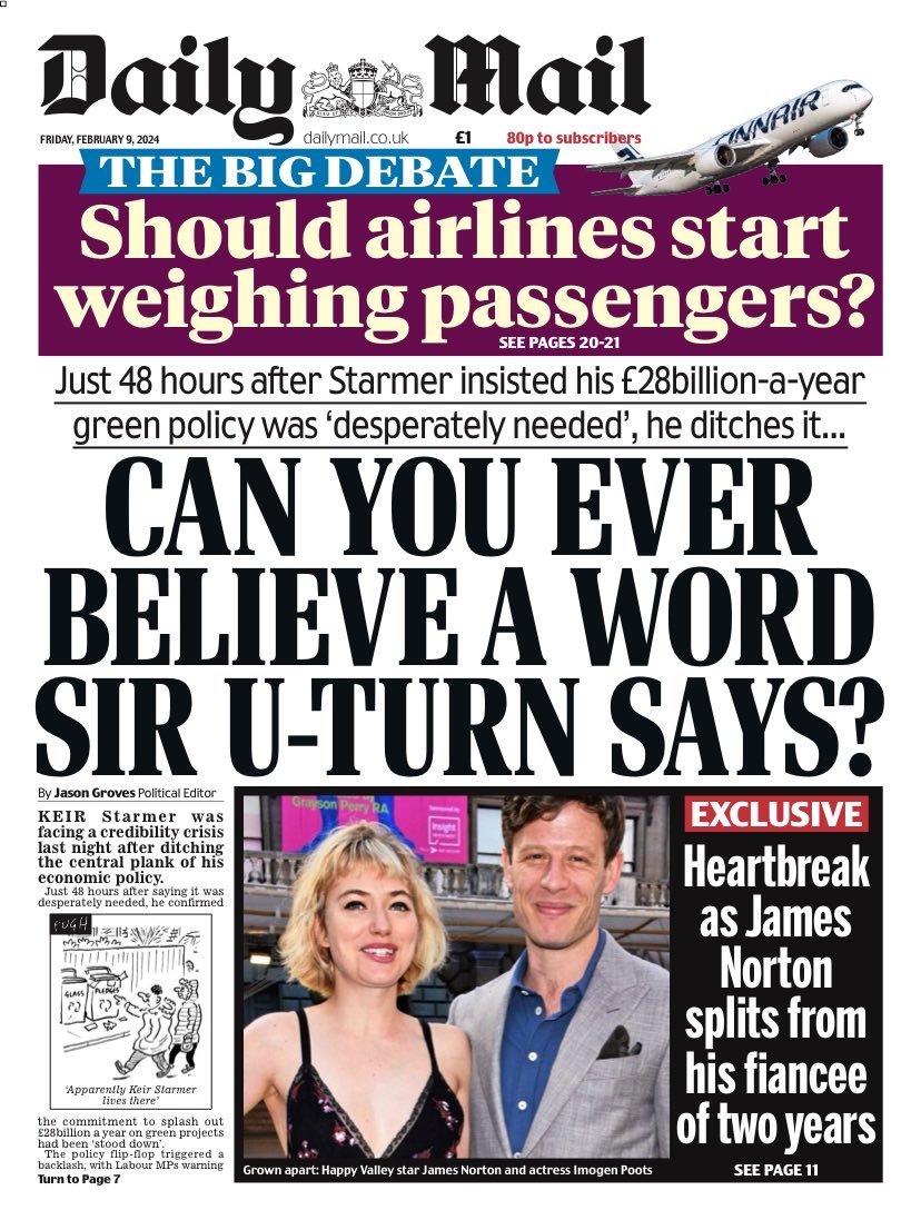 The Daily Mail highlights Sir Keir Starmer’s reversal on his £28bn green policy.