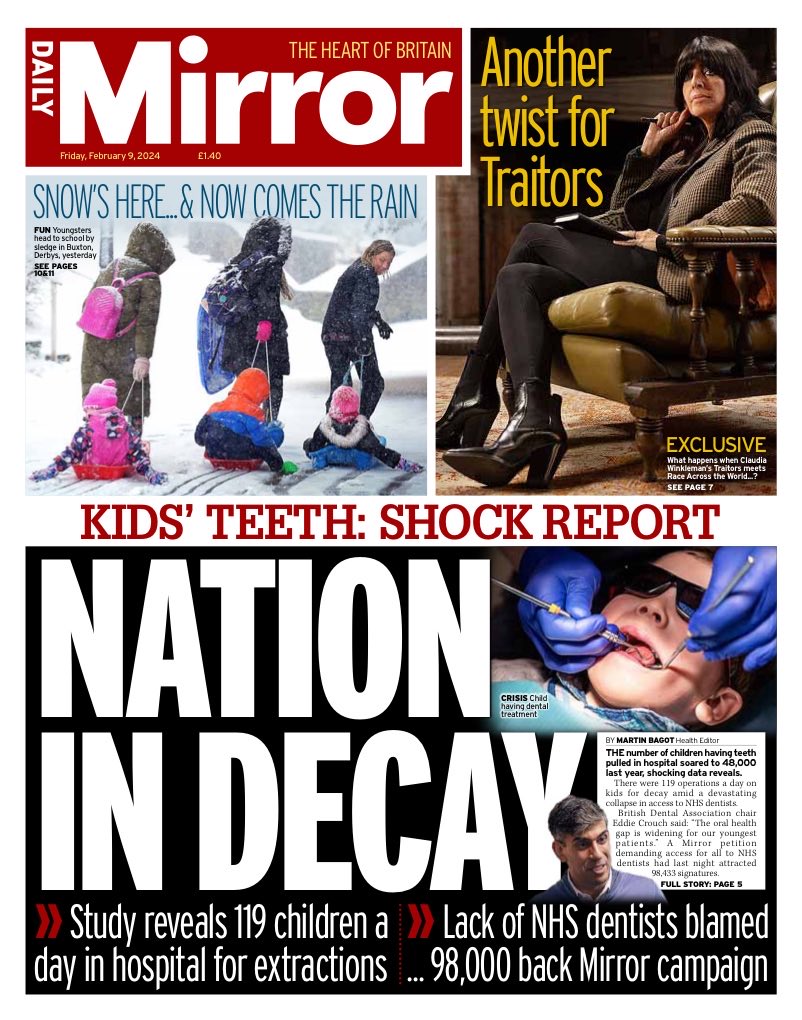 The Daily Mirror highlights the surge in children’s hospital dental extractions to 48,000 annually due to dentist access issues.
