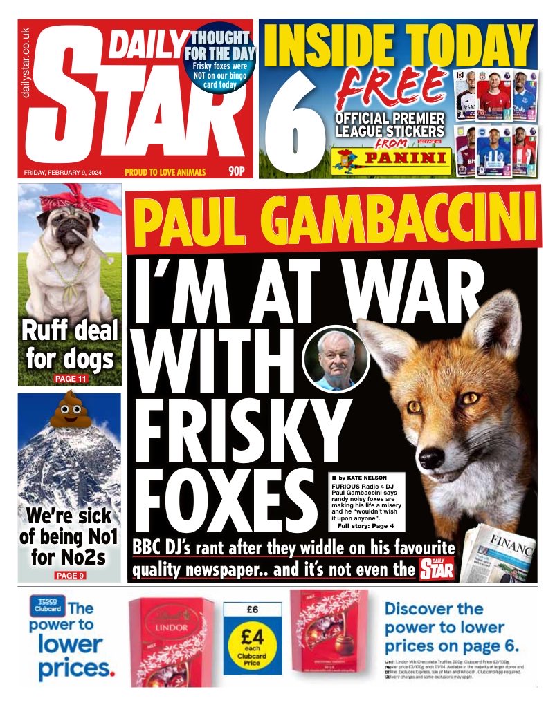 The Daily Star leads with the story of BBC DJ Paul Gambaccini’s fox troubles.