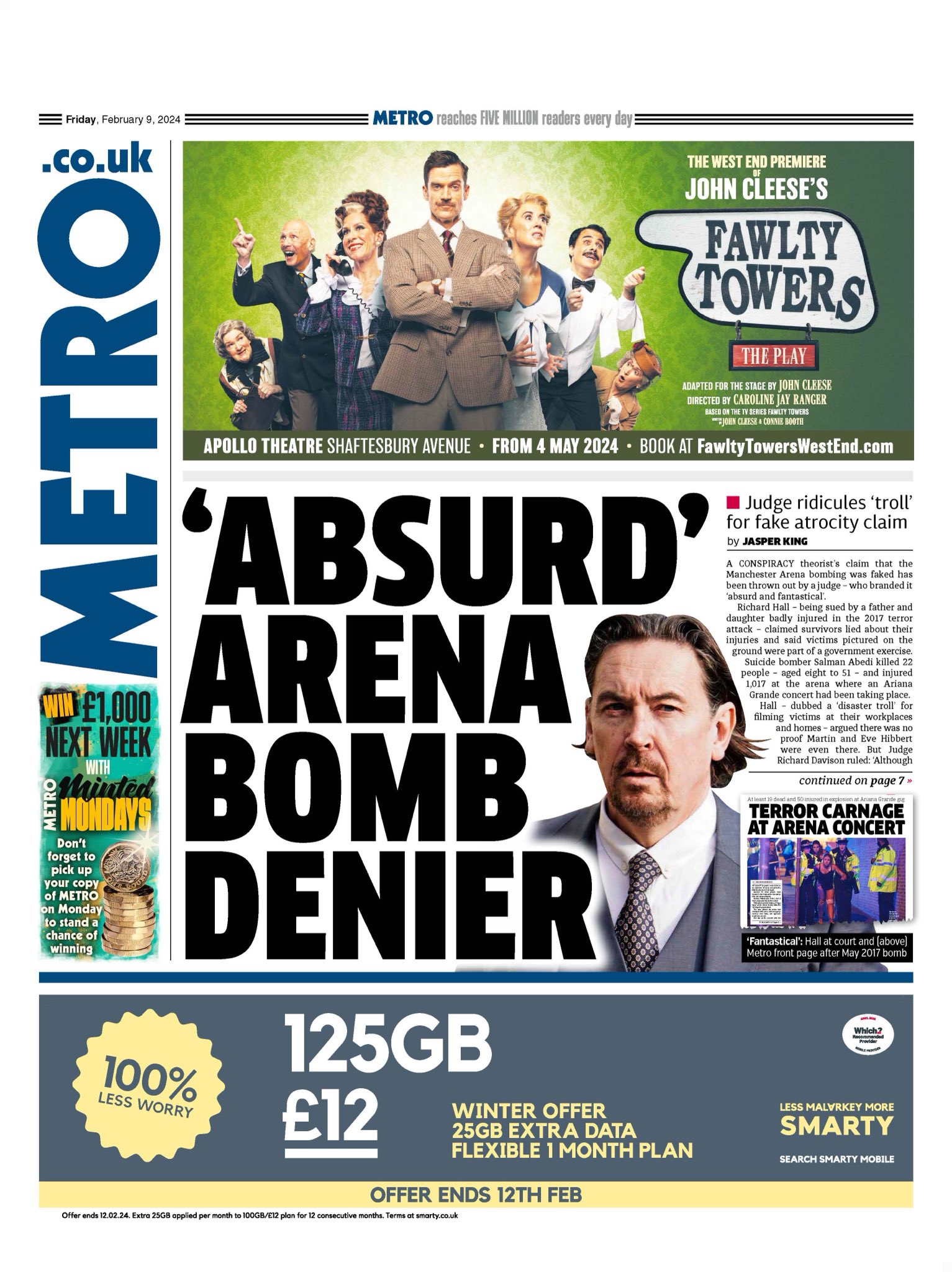 The Metro reports on a High Court judge dismissing as “absurd and fanatical” the claims of a conspiracy theorist that the Manchester Arena bombing was staged.