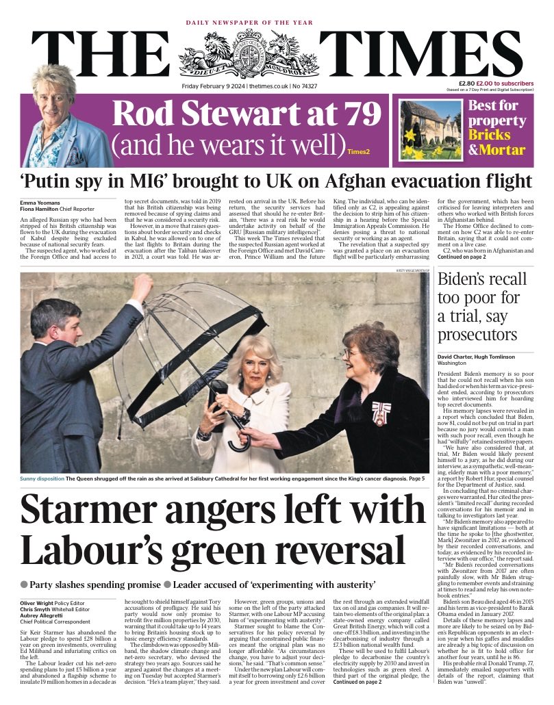 The Times reports on Sir Keir Starmer’s decision to backtrack on his £28bn green investment plan, causing discontent among his party’s left wing.