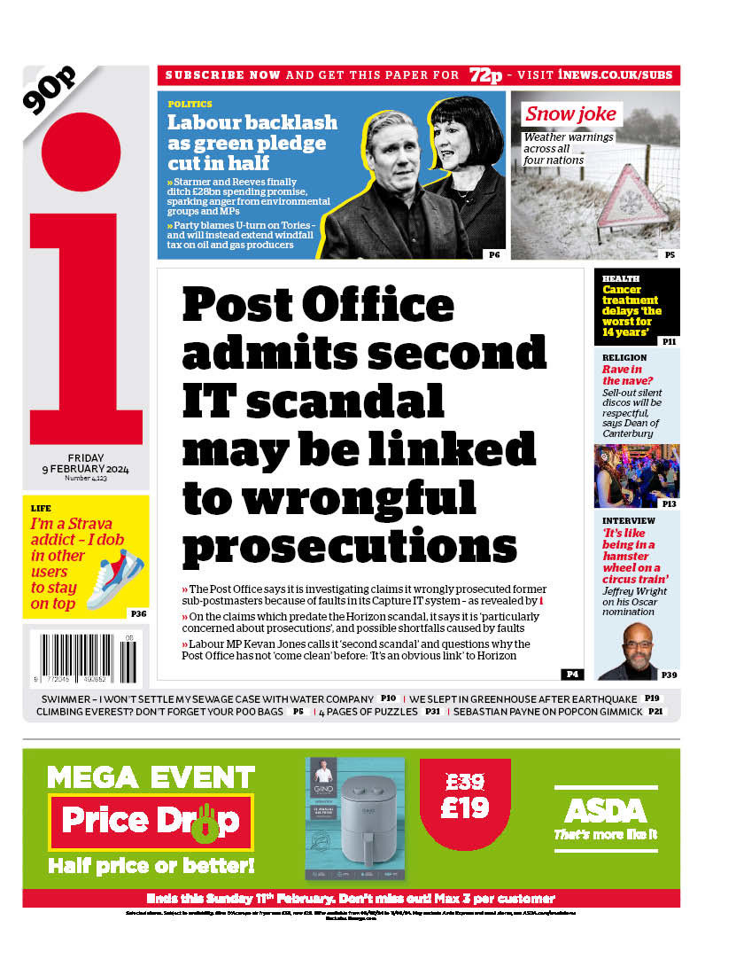 The i covers the Post Office’s potential second IT scandal causing unfair staff trials.