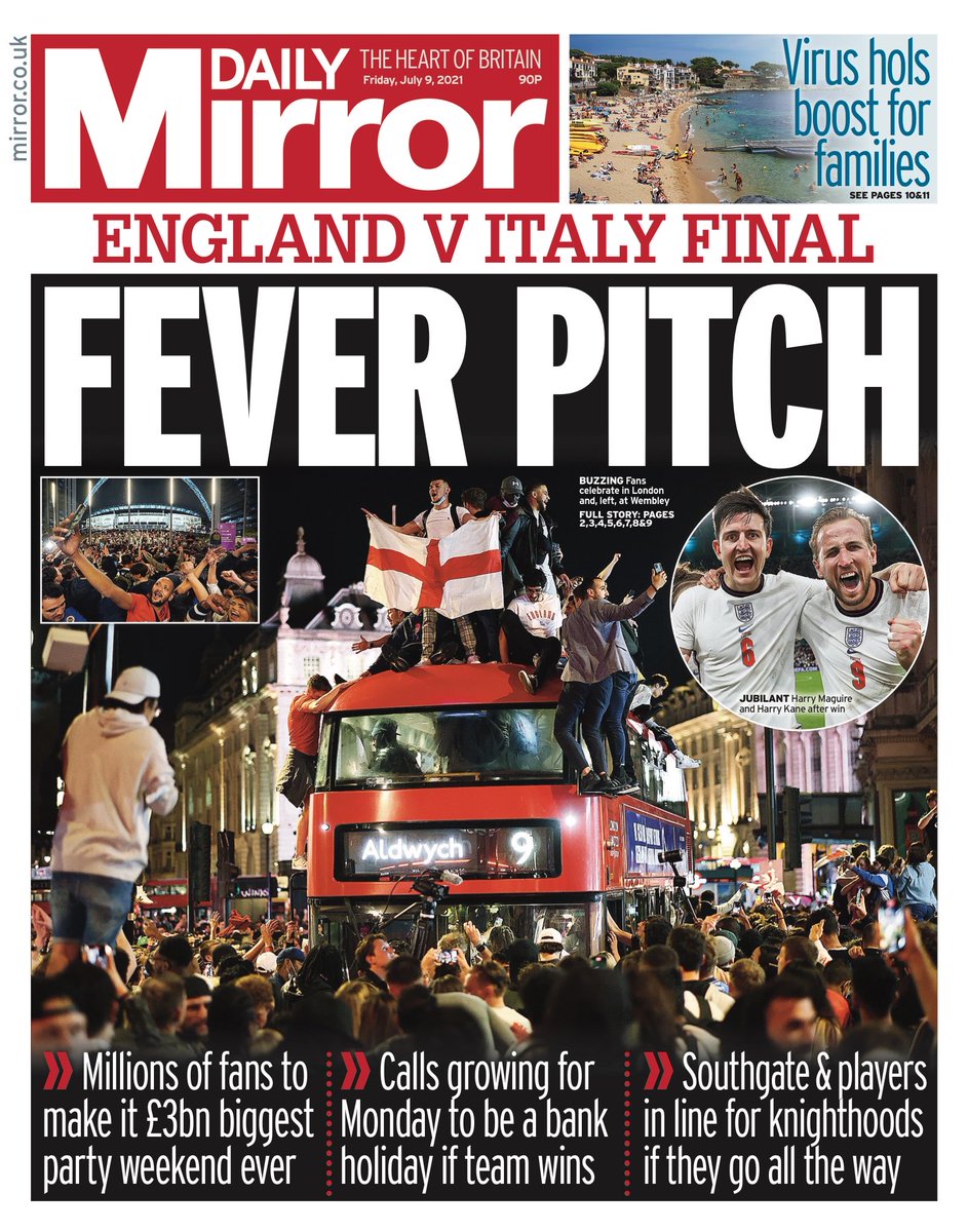 There are growing calls for Monday to be a bank holiday if England win the Euro 2020 final against Italy at Wembley on Sunday, says the Daily Mirror.