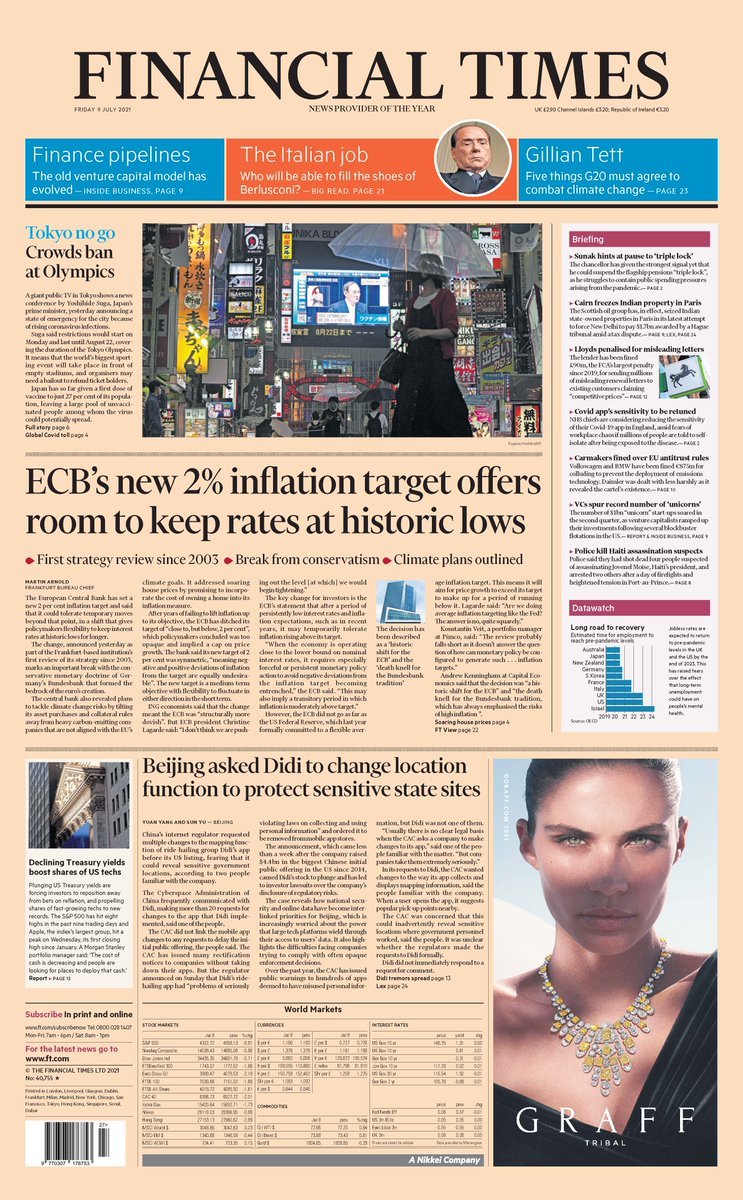 The European Central Bank has set a new 2% inflation target and said it could tolerate temporary moves beyond that point, in a shift that gives policymakers flexibility to keep interest rates at historic lows for longer, reports the Financial Times.