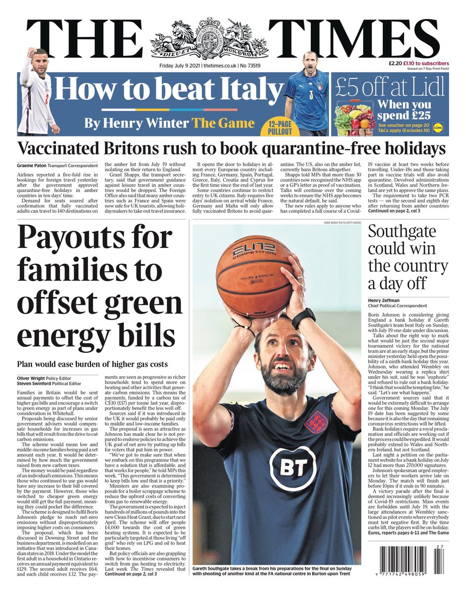 Families in Britain would be sent annual payments to offset the cost of higher gas bills and encourage a switch to green energy as part of plans under consideration in Whitehall, claims The Times.