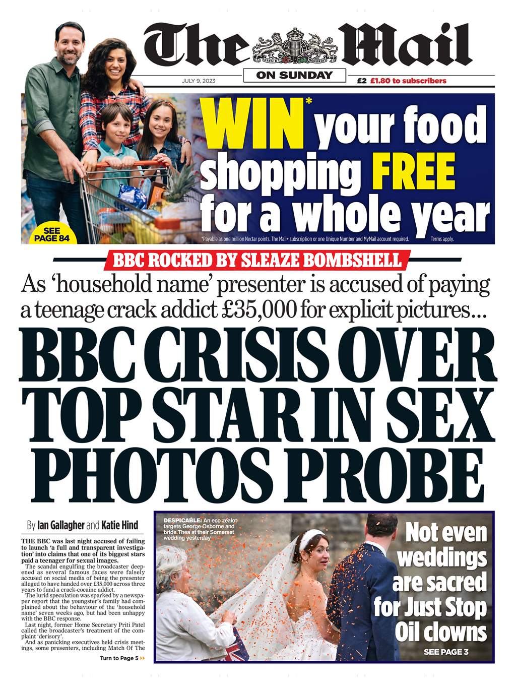 The Mail on Sunday echoes the criticism on BBC’s handling of allegations involving a star accused of paying a youth for explicit material.