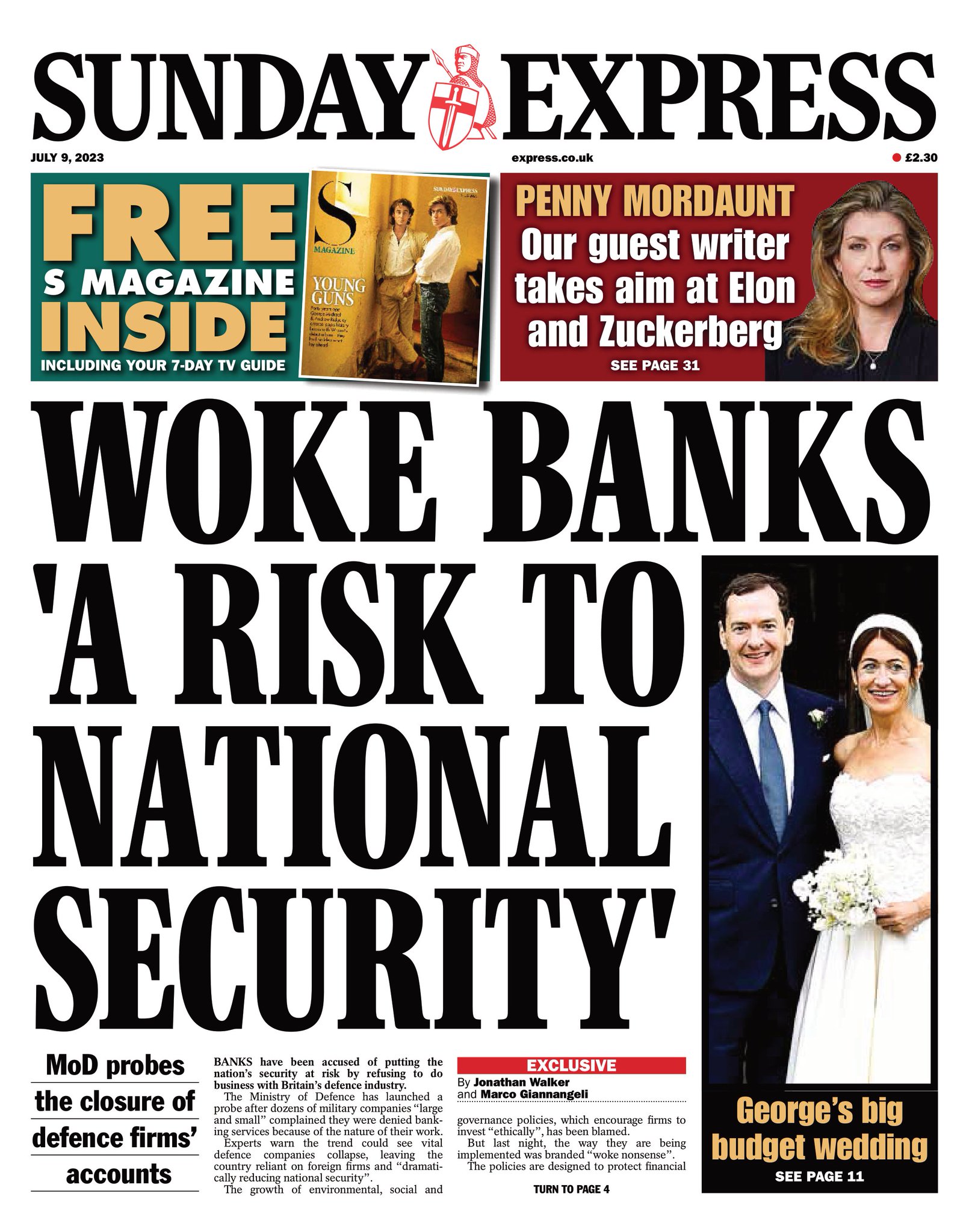 The Sunday Express accuses banks of risking Britain’s security by declining to transact with numerous military firms.