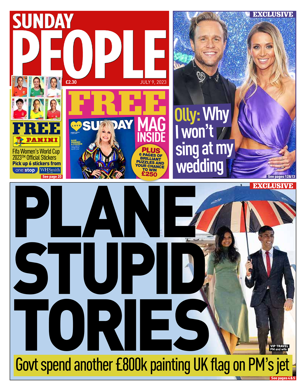 The Sunday People highlights government’s spending of an extra £800,000 to paint a UK flag on the Prime Minister’s jet.