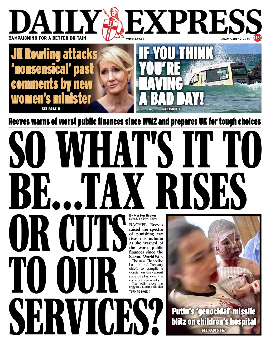 The Daily Express reports on the looming threat of significant tax increases this autumn, following the chancellor’s warning of the worst public finances since WWII.